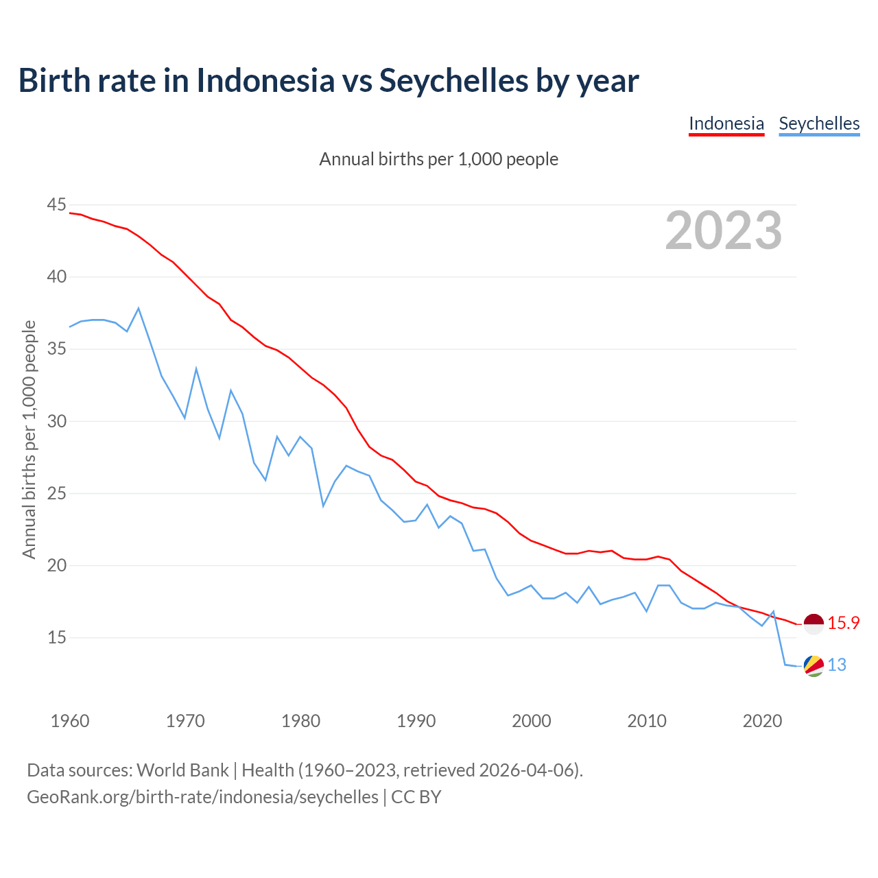 Indonesia has an annual birth rate of 15.9 births per 1,000 people, compared to 13 for the Seychelles. The average number of children a woman is expected to have during her lifetime — the fertility rate, is 2.13 in Indonesia and 2.02 in the Seychelles — 5.03% difference.