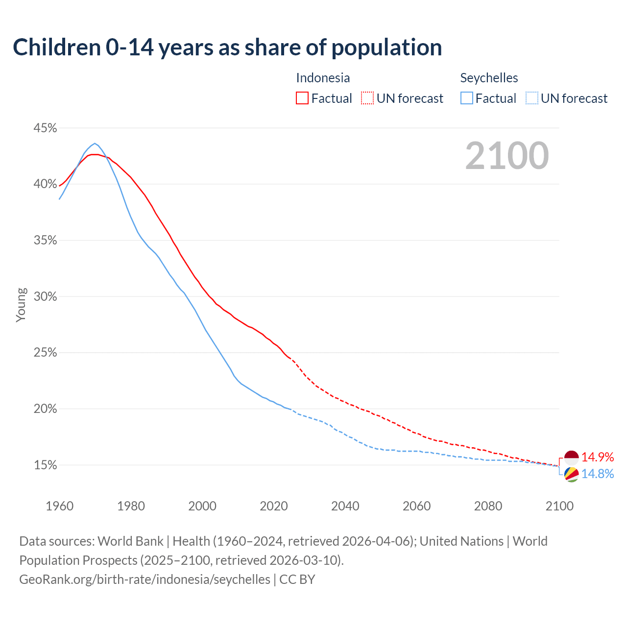 According to the latest available data on birth rates, the fertility rate in Indonesia was 2.13 children per woman in 2023, compared to 2.02 in the Seychelles in 2023. The replacement level is considered to be 2.1 children per woman.