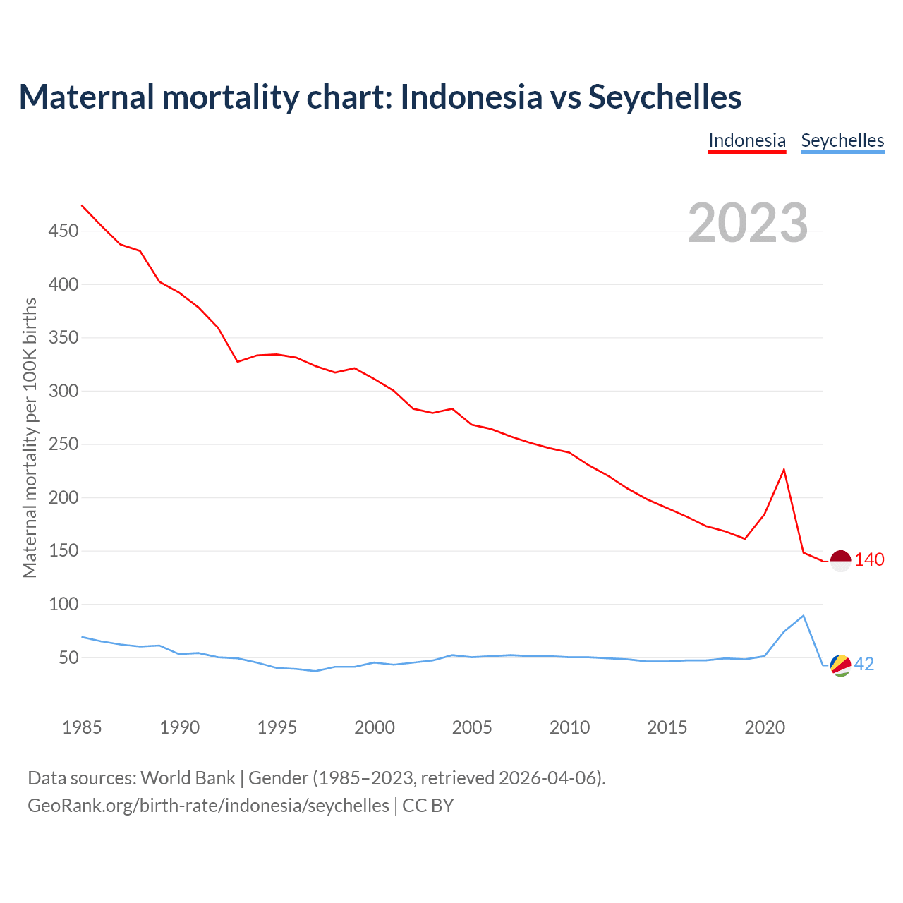 The maternal mortality rate, which is the probability of dying during childbirth or within 42 days of pregnancy termination, is 140 deaths per 100,000 live births in Indonesia, compared to 42 deaths in the Seychelles.