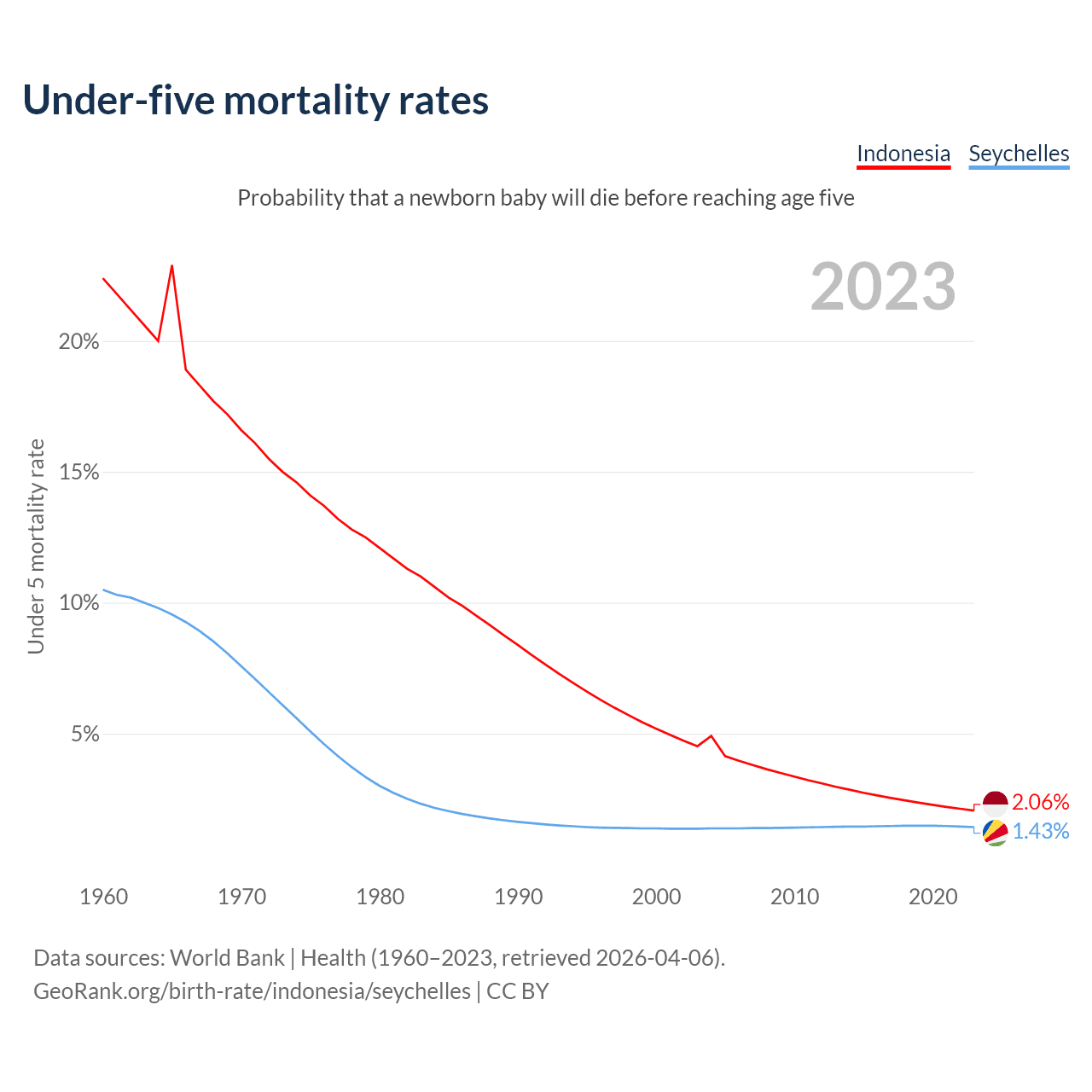 The chance that a newborn baby will die before reaching age five is 2.06% in Indonesia and 1.43% in the Seychelles. Above is a chart with historical data on under-five mortality rates.