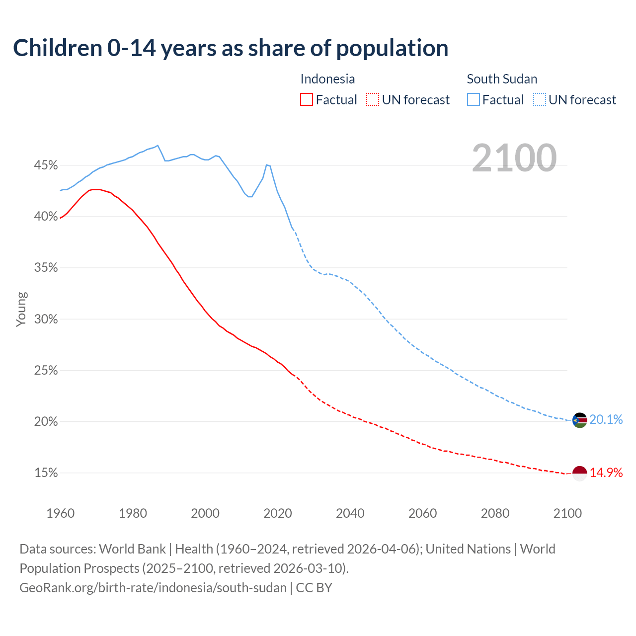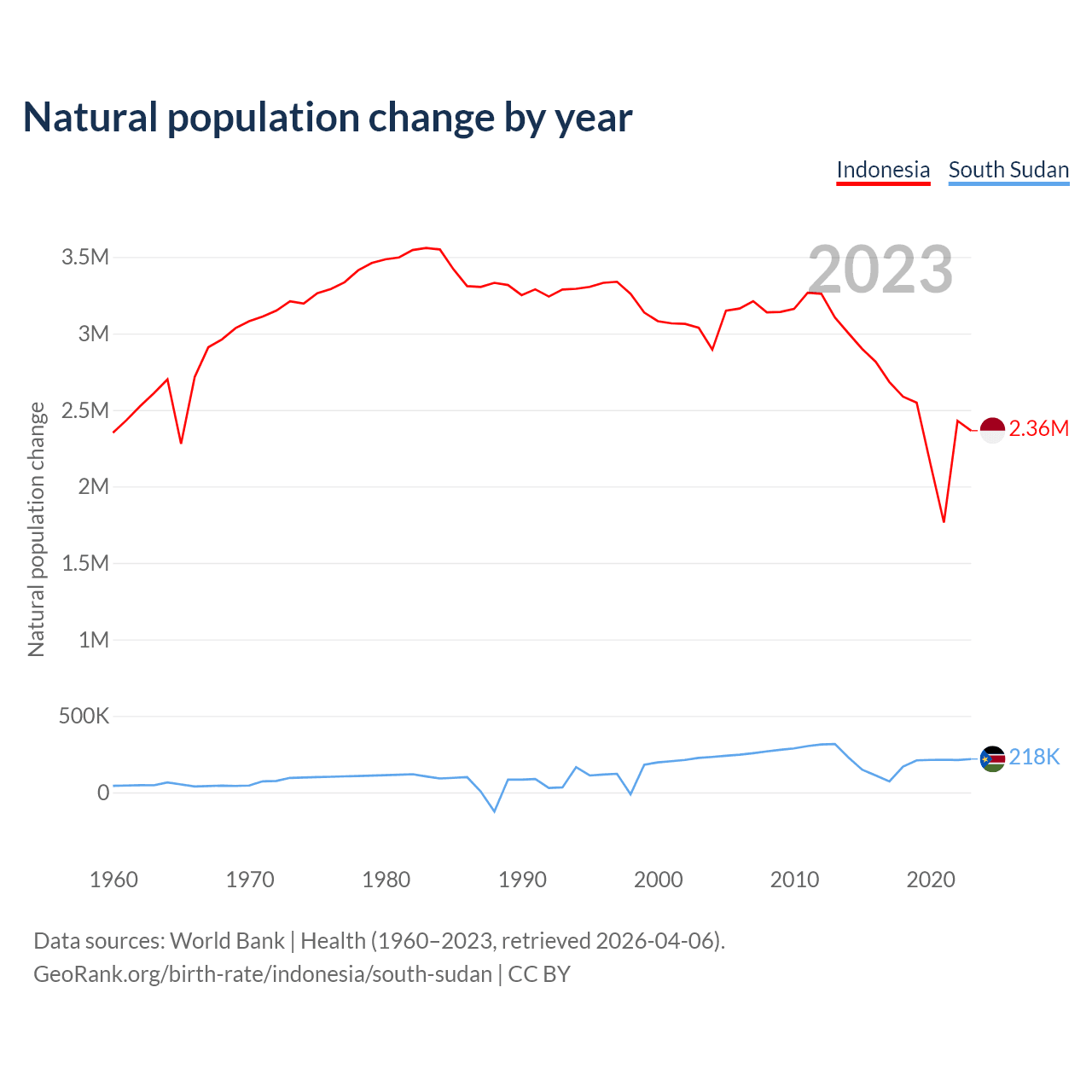 Indonesia has an annual birth rate of 15.9 births per 1,000 people, compared to 28.6 for South Sudan. The average number of children a woman is expected to have during her lifetime — the fertility rate, is 2.13 in Indonesia and 3.86 in South Sudan — 81.7% difference.