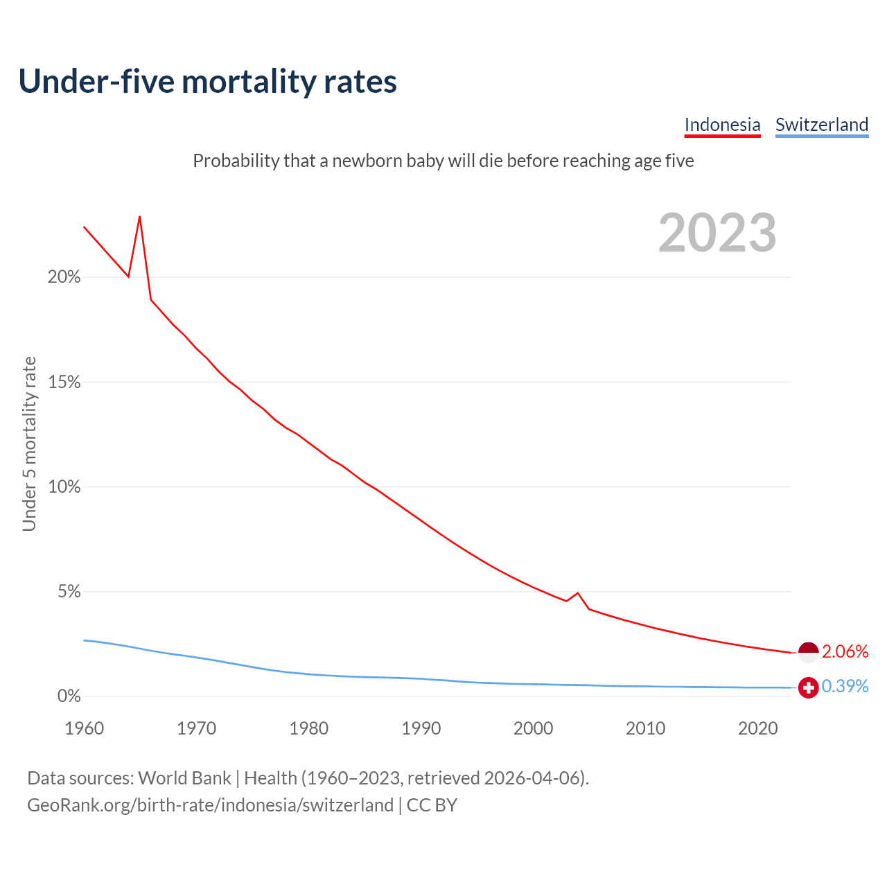 The chance that a newborn baby will die before reaching age five is 2.06% in Indonesia and 0.39% in Switzerland. Above is a chart with historical data on under-five mortality rates.