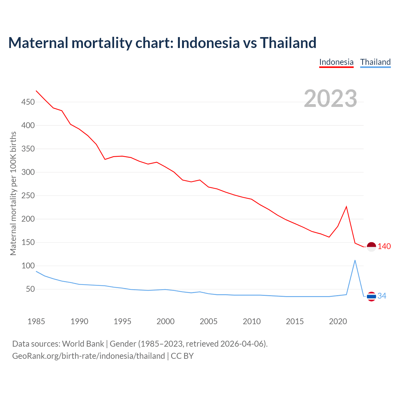 The maternal mortality rate, which is the probability of dying during childbirth or within 42 days of pregnancy termination, is 140 deaths per 100,000 live births in Indonesia, compared to 34 deaths in Thailand.