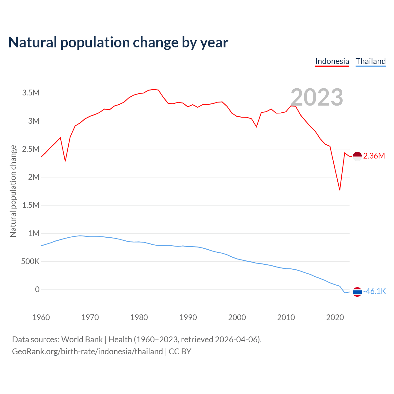 Indonesia has an annual birth rate of 15.9 births per 1,000 people, compared to 8.24 for Thailand. The average number of children a woman is expected to have during her lifetime — the fertility rate, is 2.13 in Indonesia and 1.21 in Thailand — 43% difference.