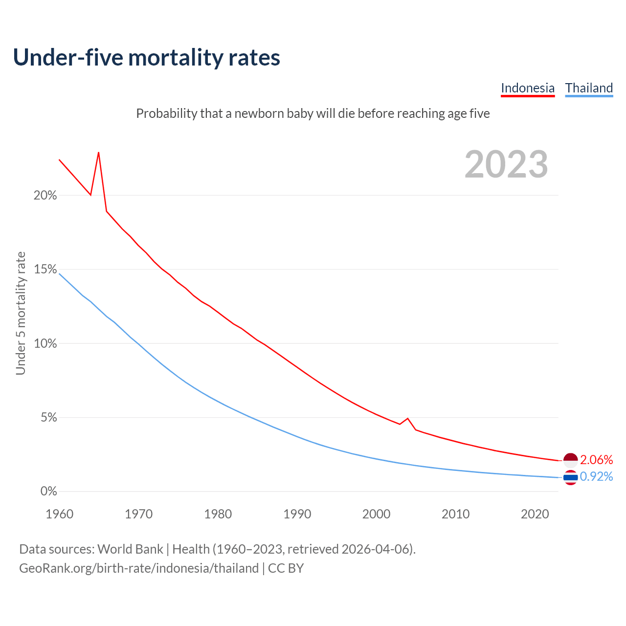 The chance that a newborn baby will die before reaching age five is 2.06% in Indonesia and 0.92% in Thailand. Above is a chart with historical data on under-five mortality rates.