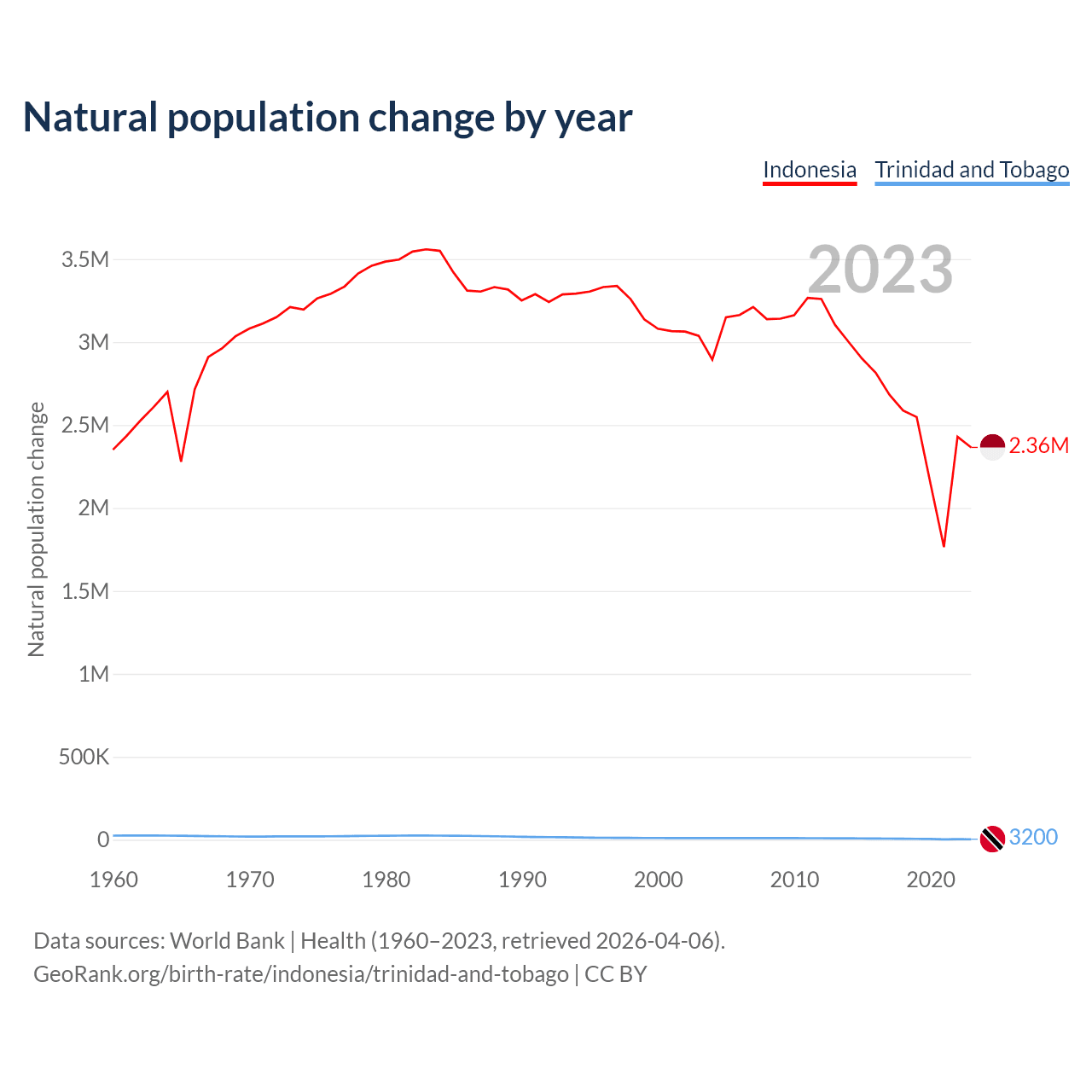 1960 vs 2023, the fertility rate has decreased by 61.4% in Indonesia and by 71.7% in Trinidad and Tobago — in 1960, it was 5.51 and 5.41, respectively.