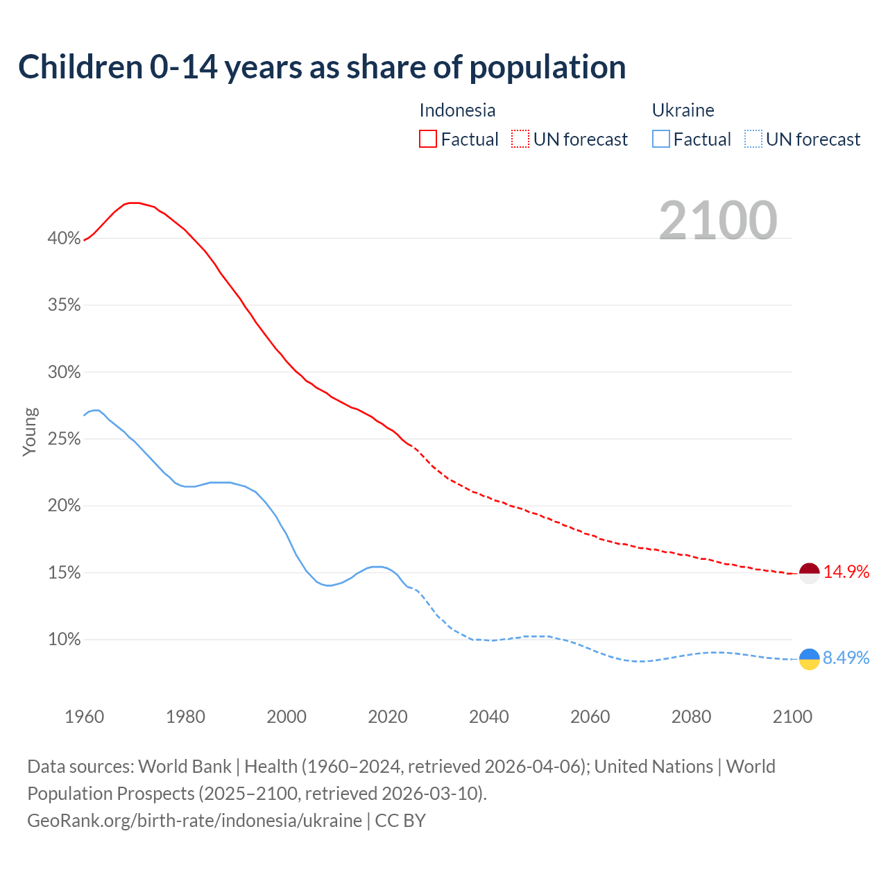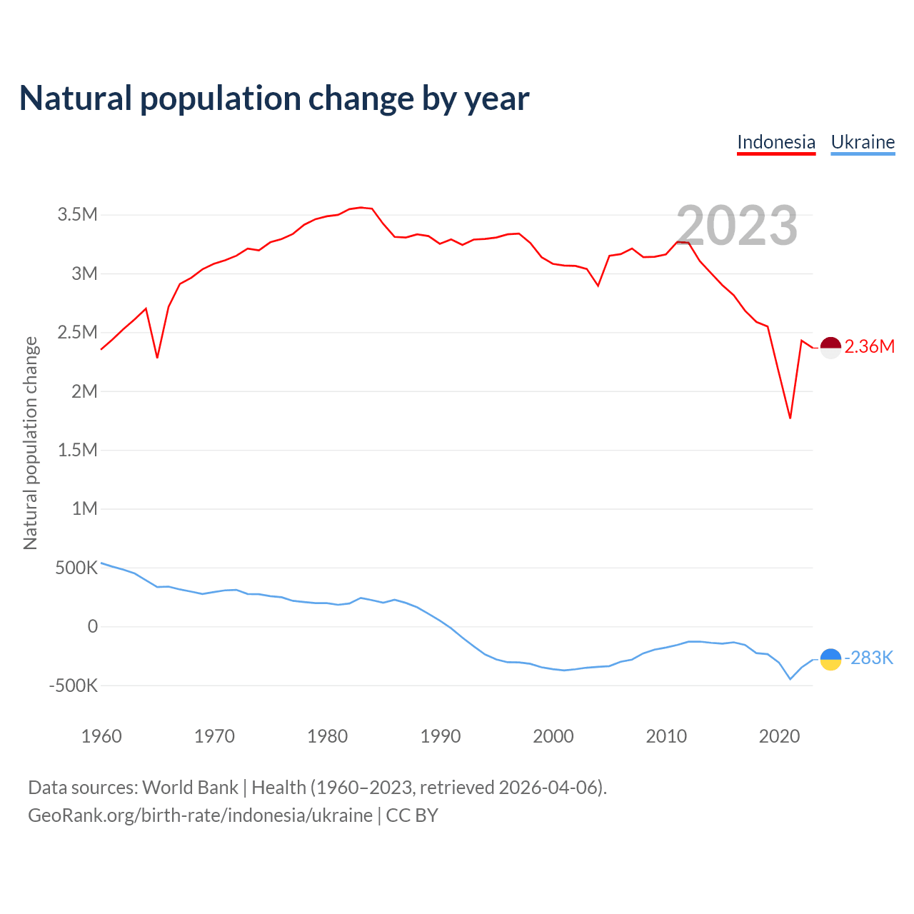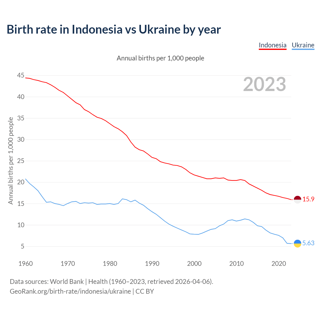 Indonesia has an annual birth rate of 15.9 births per 1,000 people, compared to 5.63 for Ukraine. The average number of children a woman is expected to have during her lifetime — the fertility rate, is 2.13 in Indonesia and 0.98 in Ukraine — 54.1% difference.