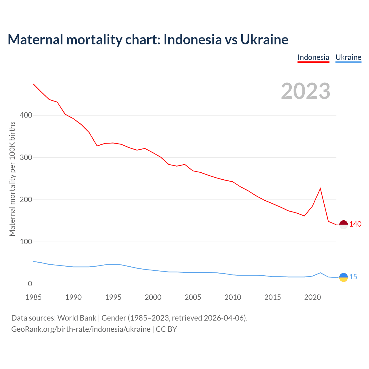 The maternal mortality rate, which is the probability of dying during childbirth or within 42 days of pregnancy termination, is 140 deaths per 100,000 live births in Indonesia, compared to 15 deaths in Ukraine.
