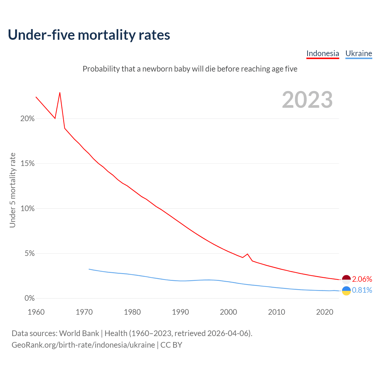 The chance that a newborn baby will die before reaching age five is 2.06% in Indonesia and 0.81% in Ukraine. Above is a chart with historical data on under-five mortality rates.