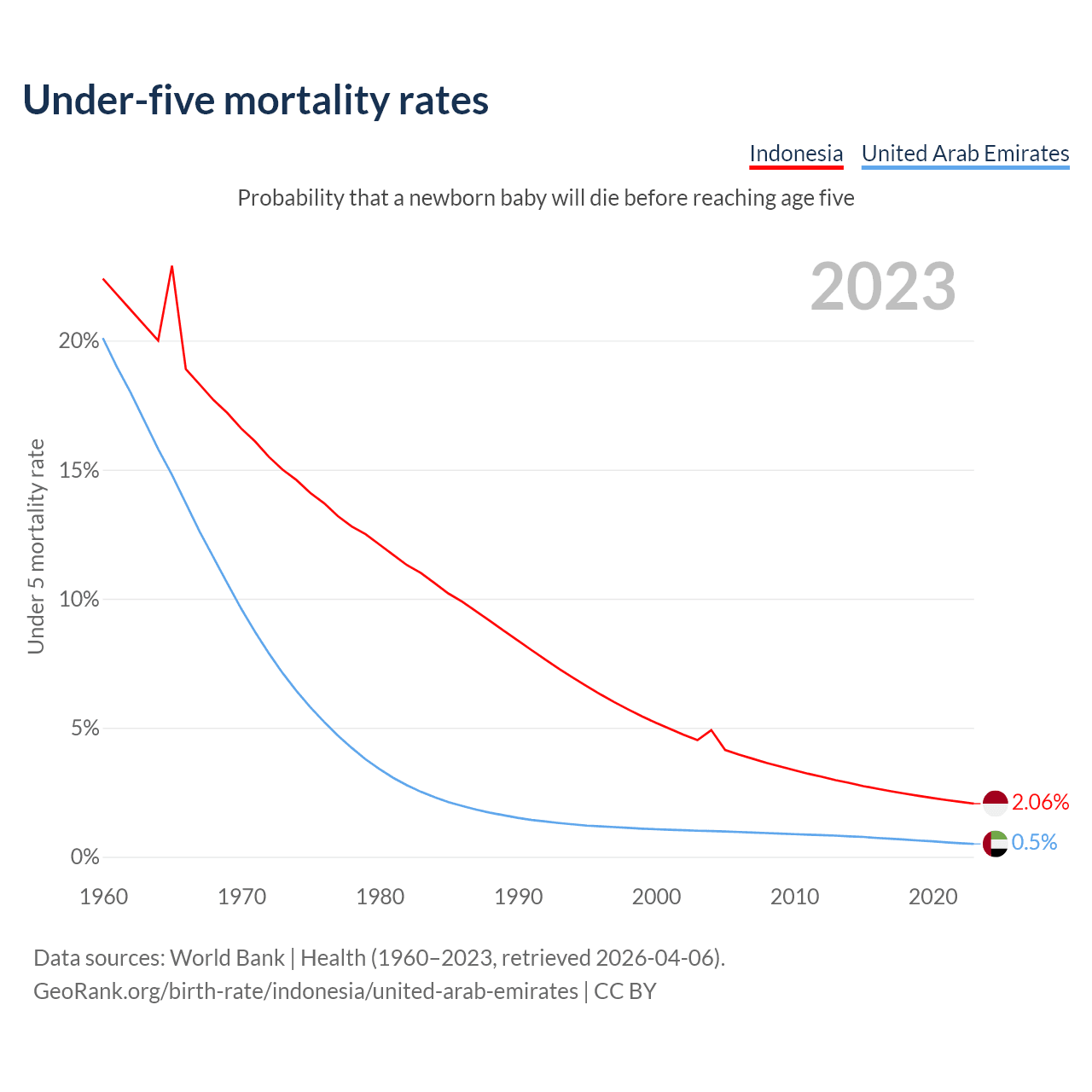 The chance that a newborn baby will die before reaching age five is 2.06% in Indonesia and 0.5% in the United Arab Emirates. Above is a chart with historical data on under-five mortality rates.