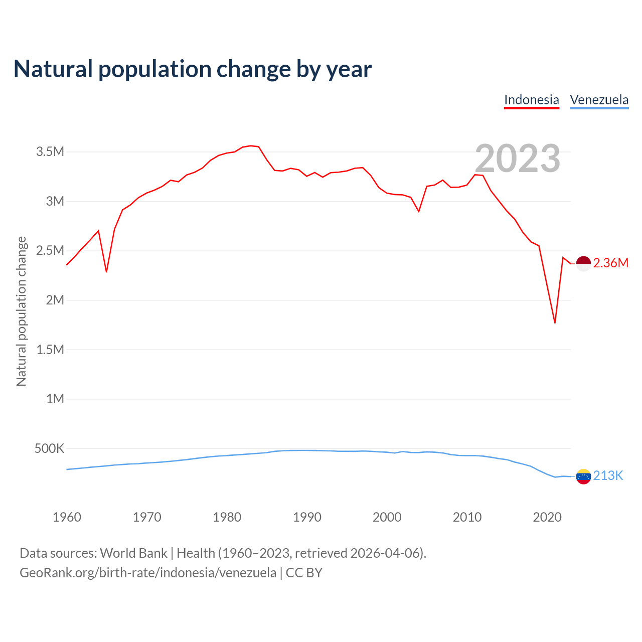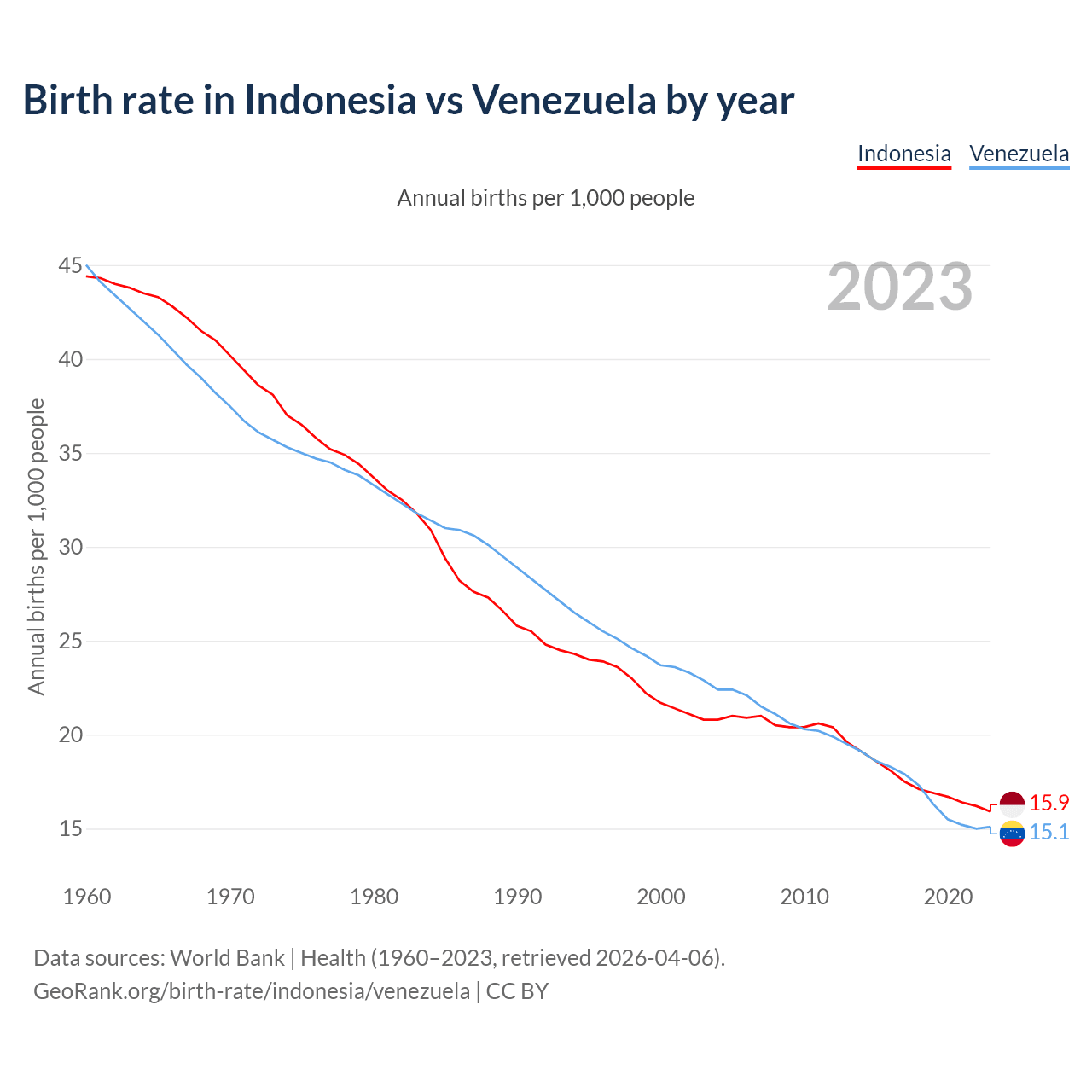 Indonesia has an annual birth rate of 15.9 births per 1,000 people, compared to 15.1 for Venezuela. The average number of children a woman is expected to have during her lifetime — the fertility rate, is 2.13 in Indonesia and 2.08 in Venezuela — 2.26% difference.