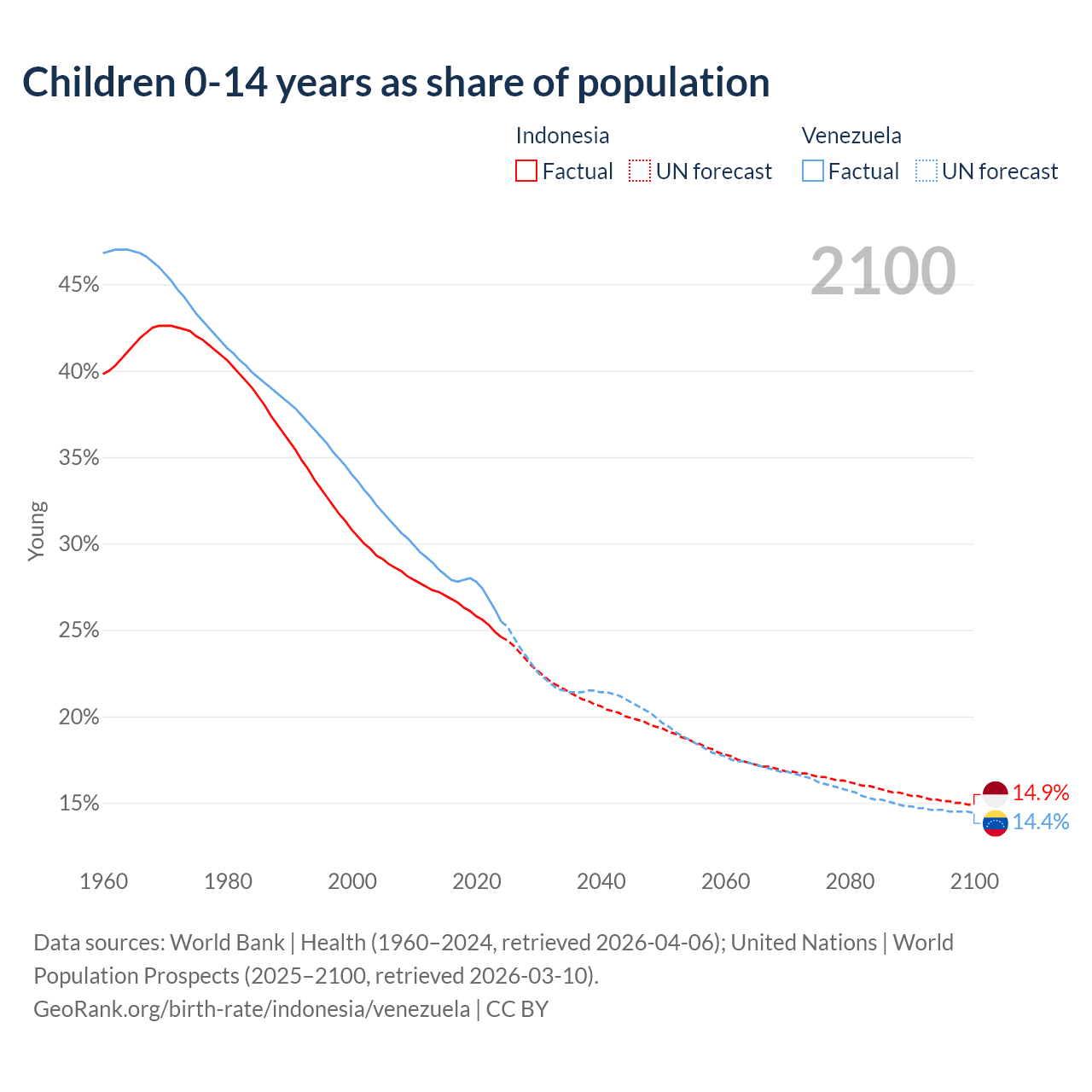 According to the latest available data on birth rates, the fertility rate in Indonesia was 2.13 children per woman in 2023, compared to 2.08 in Venezuela in 2023. The replacement level is considered to be 2.1 children per woman.