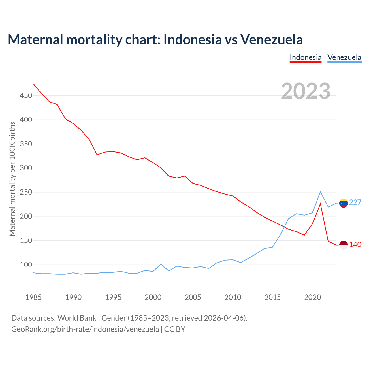 The maternal mortality rate, which is the probability of dying during childbirth or within 42 days of pregnancy termination, is 140 deaths per 100,000 live births in Indonesia, compared to 227 deaths in Venezuela.