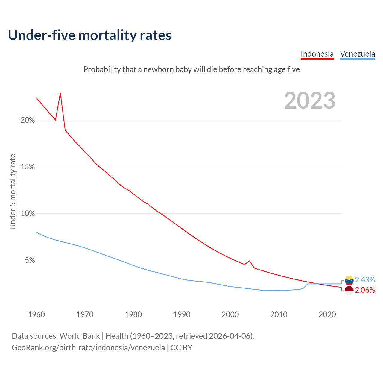 The chance that a newborn baby will die before reaching age five is 2.06% in Indonesia and 2.43% in Venezuela. Above is a chart with historical data on under-five mortality rates.