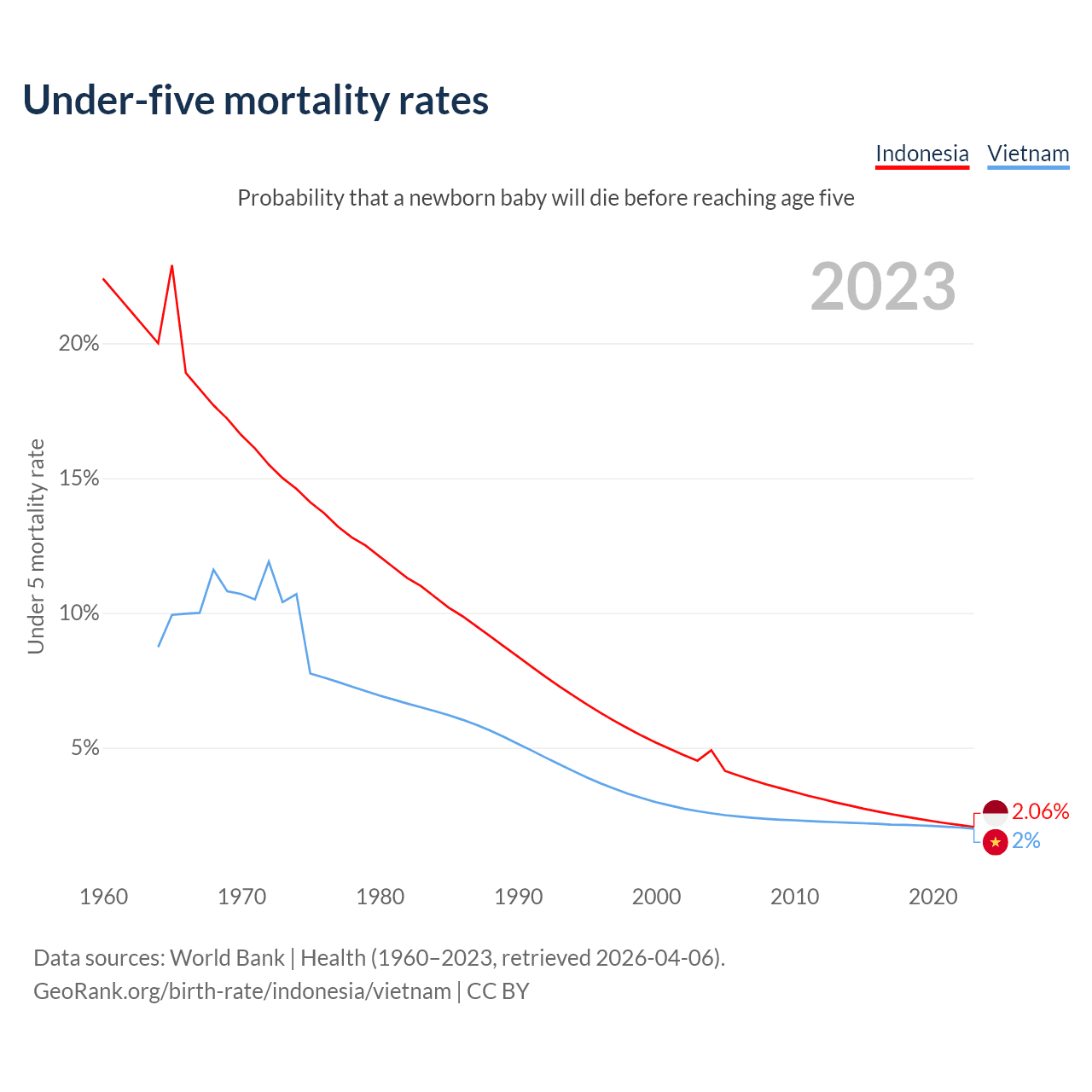 The chance that a newborn baby will die before reaching age five is 2.06% in Indonesia and 2% in Vietnam. Above is a chart with historical data on under-five mortality rates.