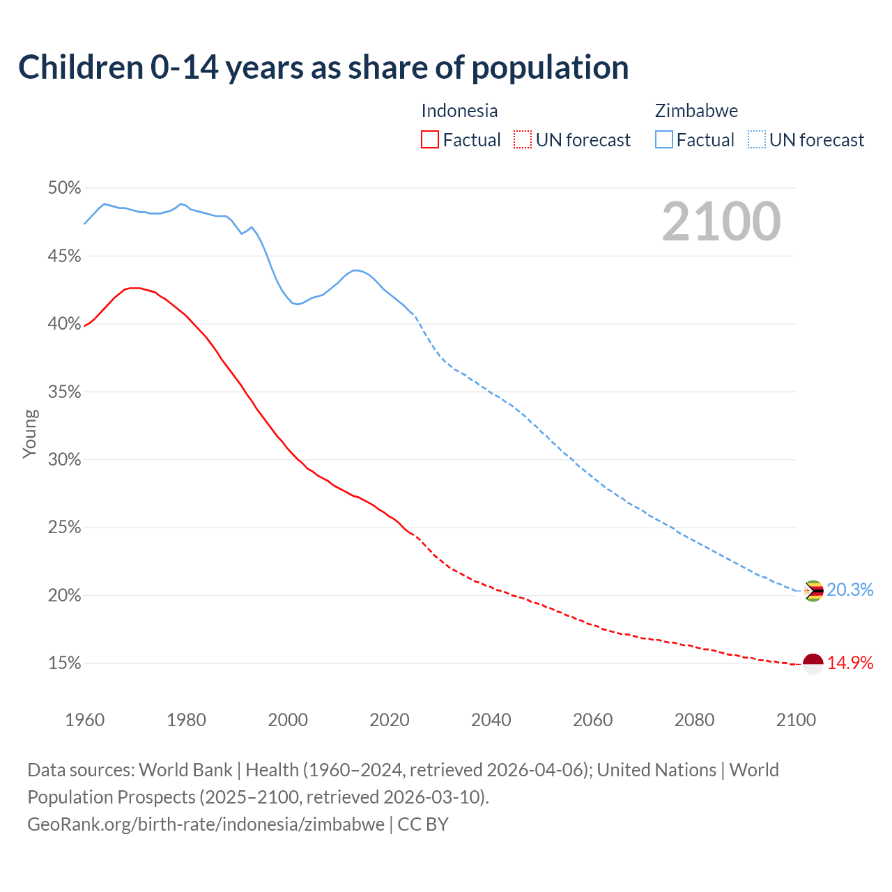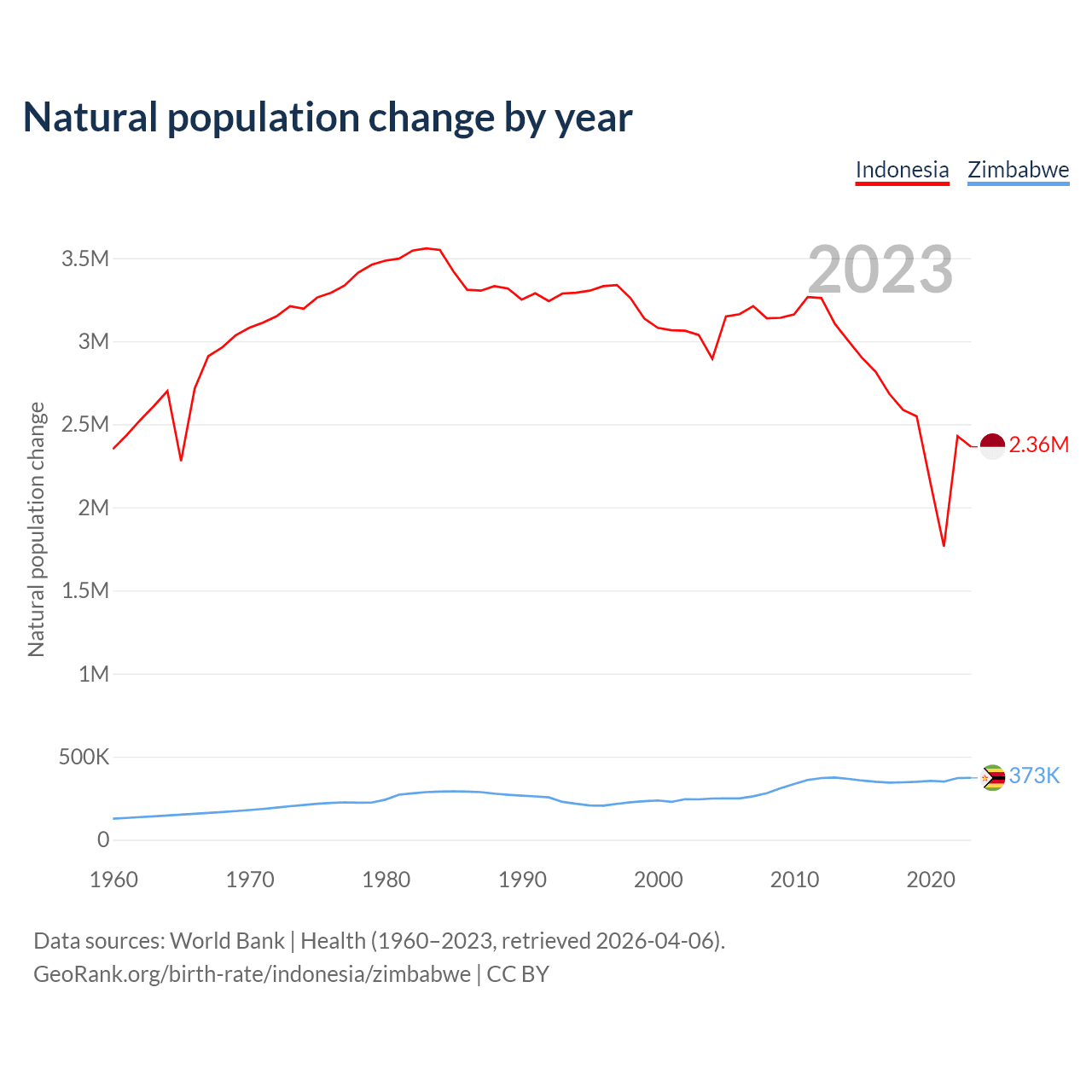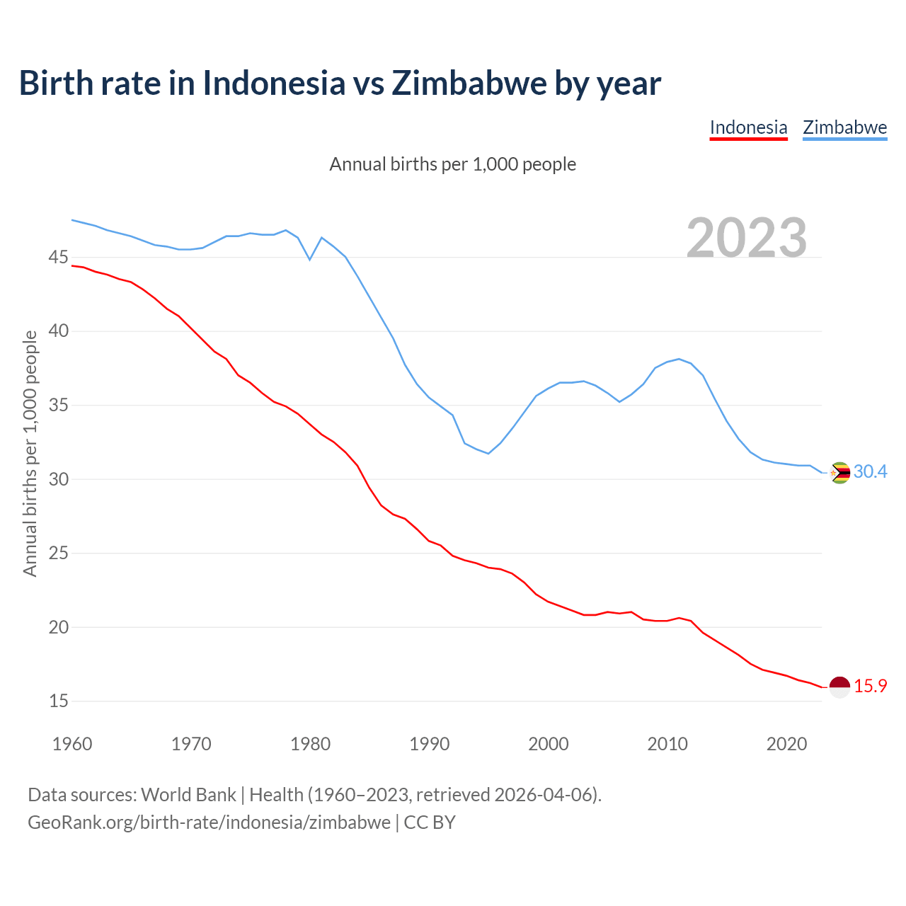 Indonesia has an annual birth rate of 15.9 births per 1,000 people, compared to 30.4 for Zimbabwe. The average number of children a woman is expected to have during her lifetime — the fertility rate, is 2.13 in Indonesia and 3.72 in Zimbabwe — 75.1% difference.