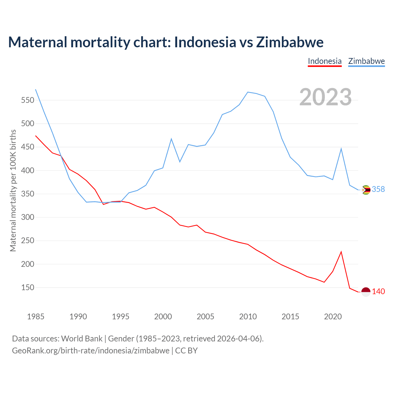 The maternal mortality rate, which is the probability of dying during childbirth or within 42 days of pregnancy termination, is 140 deaths per 100,000 live births in Indonesia, compared to 358 deaths in Zimbabwe.