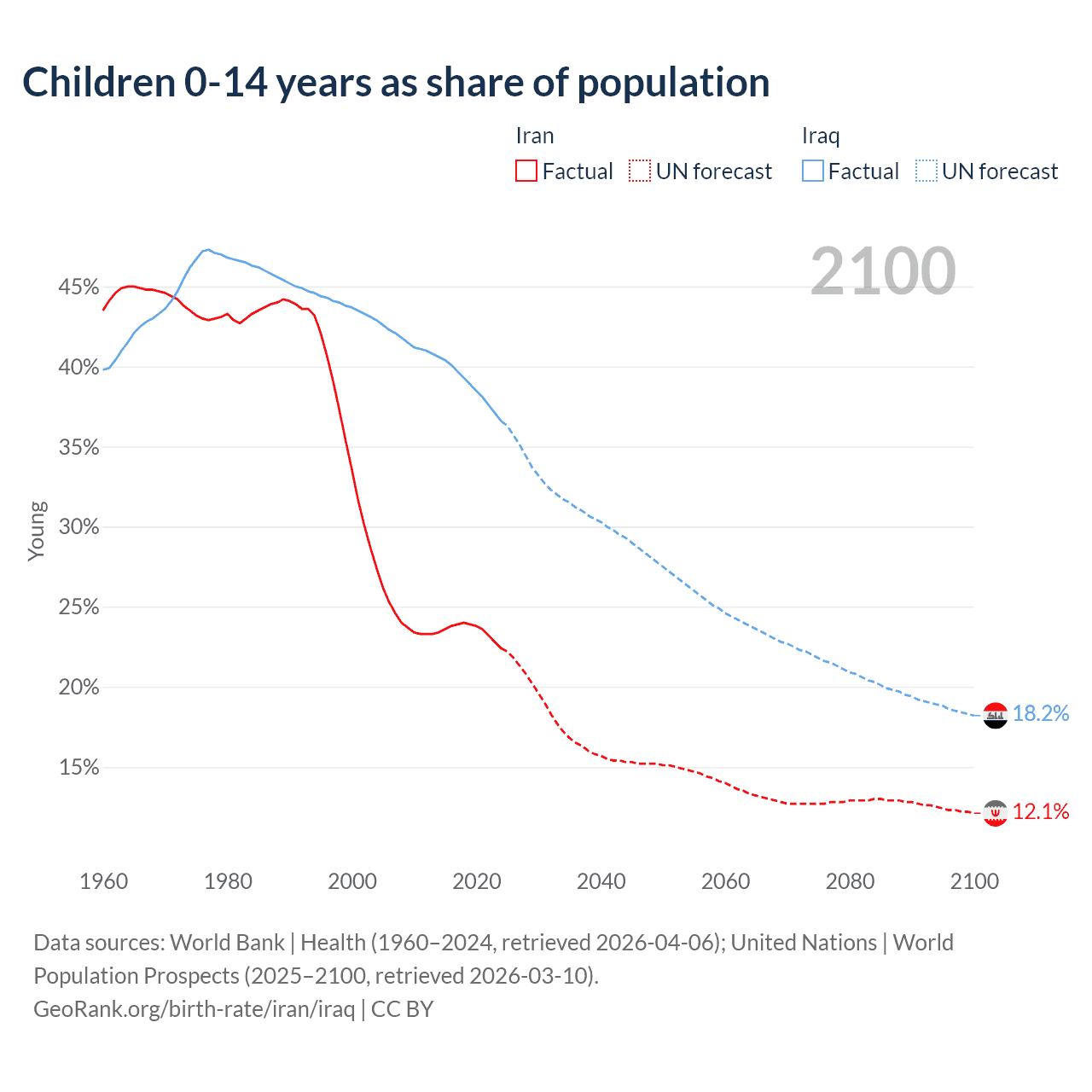 Iran has an annual birth rate of 13 births per 1,000 people, compared to 25.7 for Iraq. The average number of children a woman is expected to have during her lifetime — the fertility rate, is 1.7 in Iran and 3.25 in Iraq — 91.7% difference.