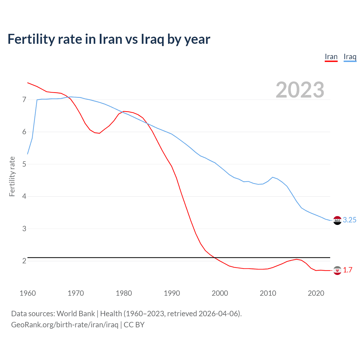According to the latest available data on birth rates, the fertility rate in Iran was 1.7 children per woman in 2023, compared to 3.25 in Iraq in 2023. The replacement level is considered to be 2.1 children per woman.