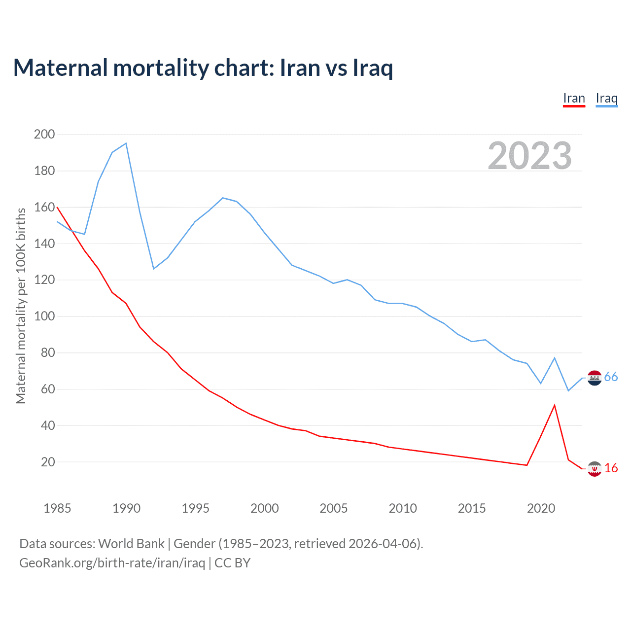 The maternal mortality rate, which is the probability of dying during childbirth or within 42 days of pregnancy termination, is 16 deaths per 100,000 live births in Iran, compared to 66 deaths in Iraq.