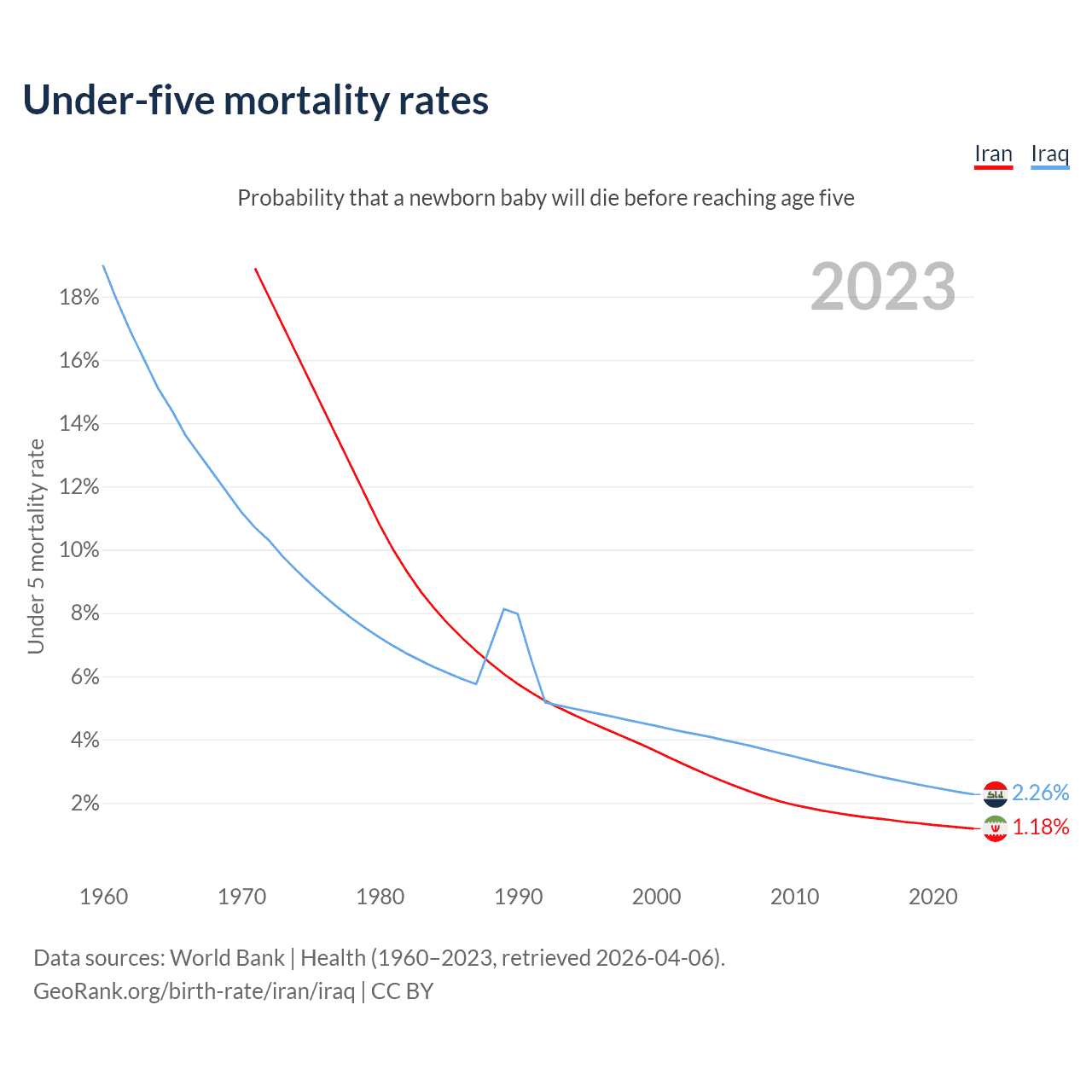 The chance that a newborn baby will die before reaching age five is 1.18% in Iran and 2.26% in Iraq. Above is a chart with historical data on under-five mortality rates.