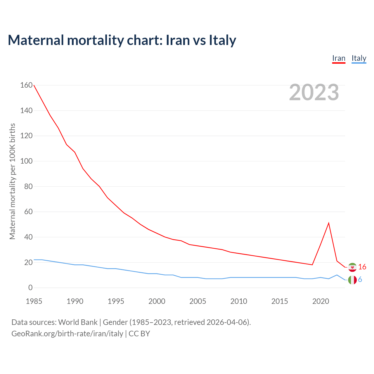The maternal mortality rate, which is the probability of dying during childbirth or within 42 days of pregnancy termination, is 16 deaths per 100,000 live births in Iran, compared to 6 deaths in Italy.