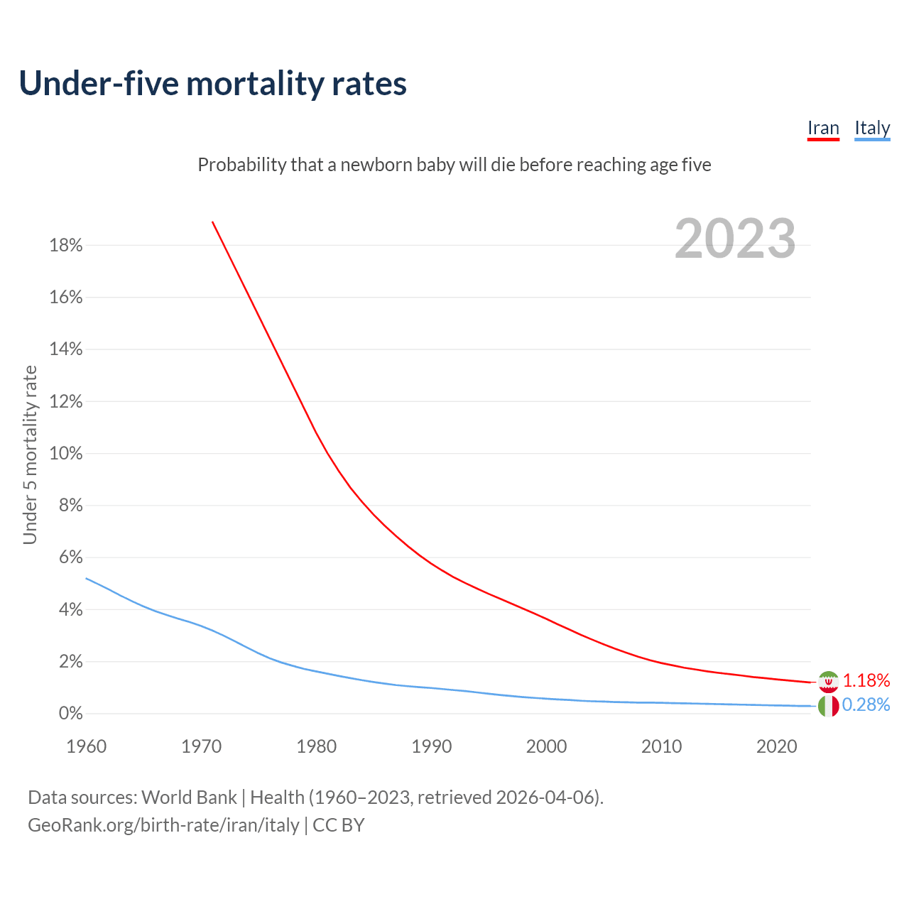 The chance that a newborn baby will die before reaching age five is 1.18% in Iran and 0.28% in Italy. Above is a chart with historical data on under-five mortality rates.