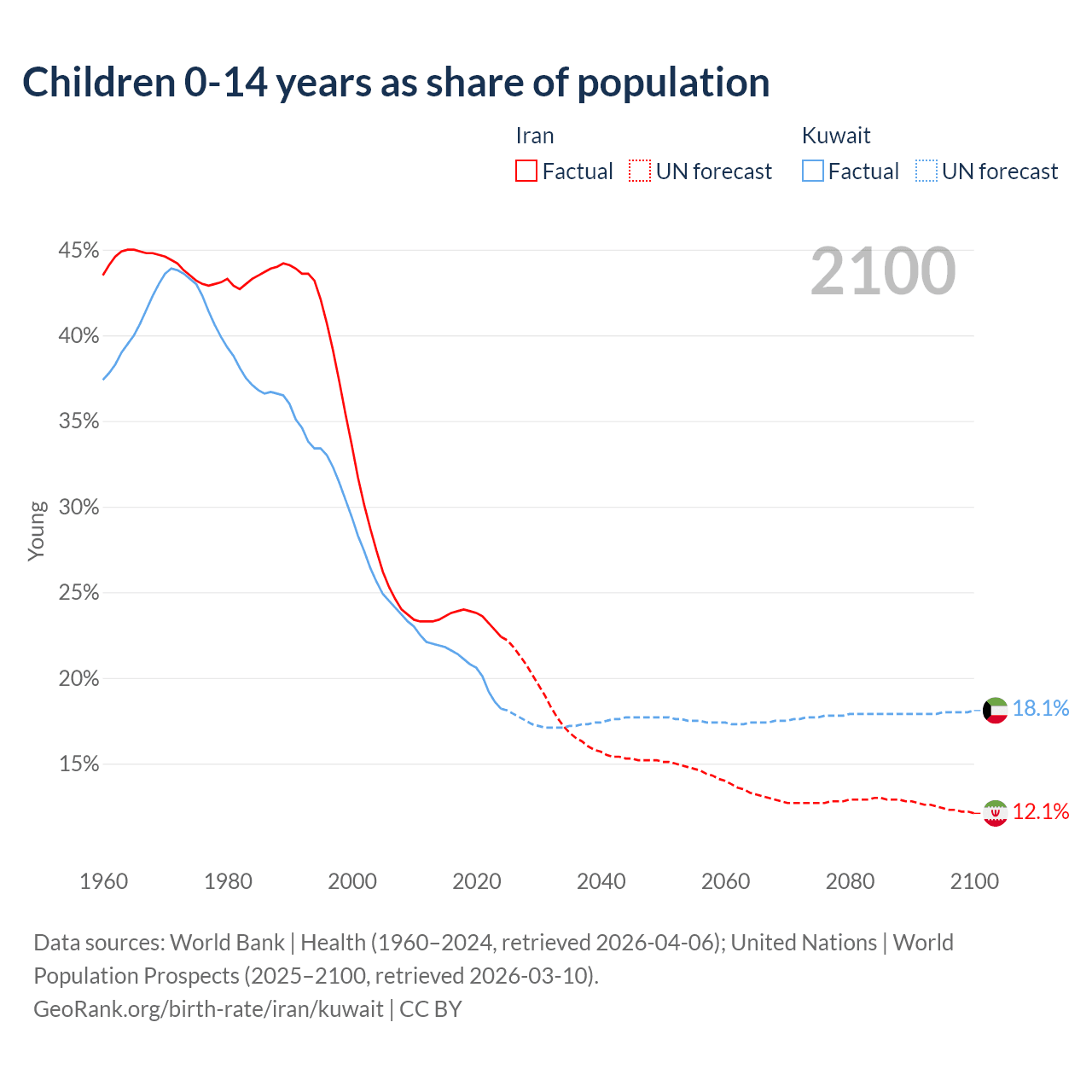 According to the latest available data on birth rates, the fertility rate in Iran was 1.7 children per woman in 2023, compared to 1.52 in Kuwait in 2023. The replacement level is considered to be 2.1 children per woman.