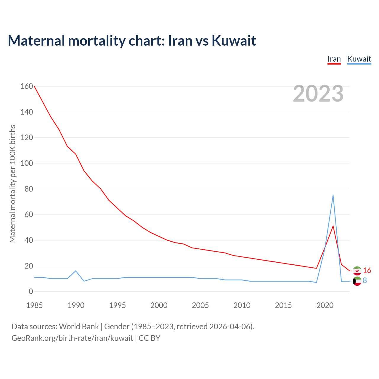 The maternal mortality rate, which is the probability of dying during childbirth or within 42 days of pregnancy termination, is 16 deaths per 100,000 live births in Iran, compared to 8 deaths in Kuwait.