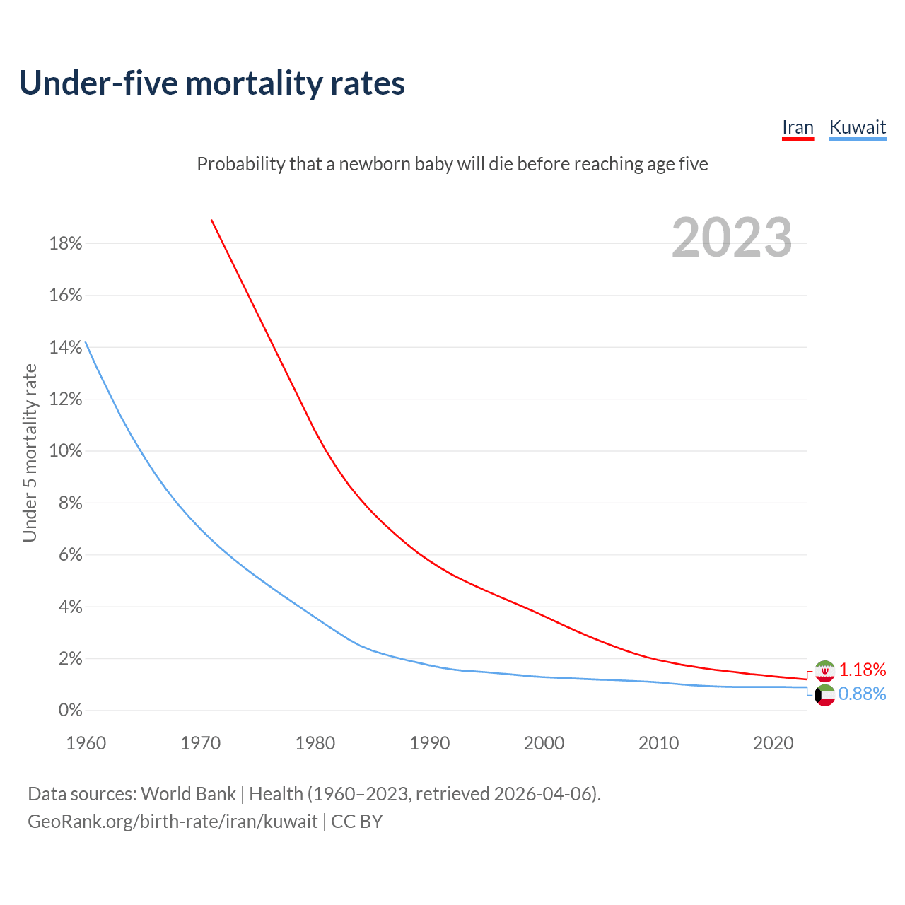 The chance that a newborn baby will die before reaching age five is 1.18% in Iran and 0.88% in Kuwait. Above is a chart with historical data on under-five mortality rates.