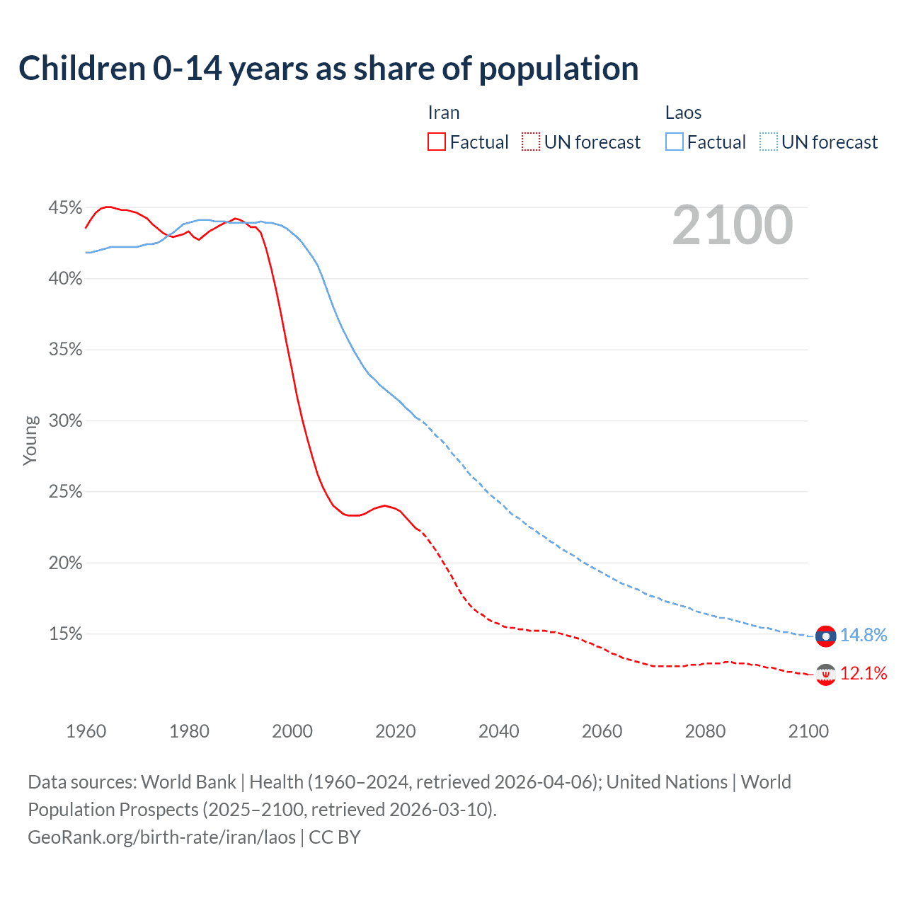 Iran has an annual birth rate of 13 births per 1,000 people, compared to 21.3 for Laos. The average number of children a woman is expected to have during her lifetime — the fertility rate, is 1.7 in Iran and 2.42 in Laos — 42.8% difference.