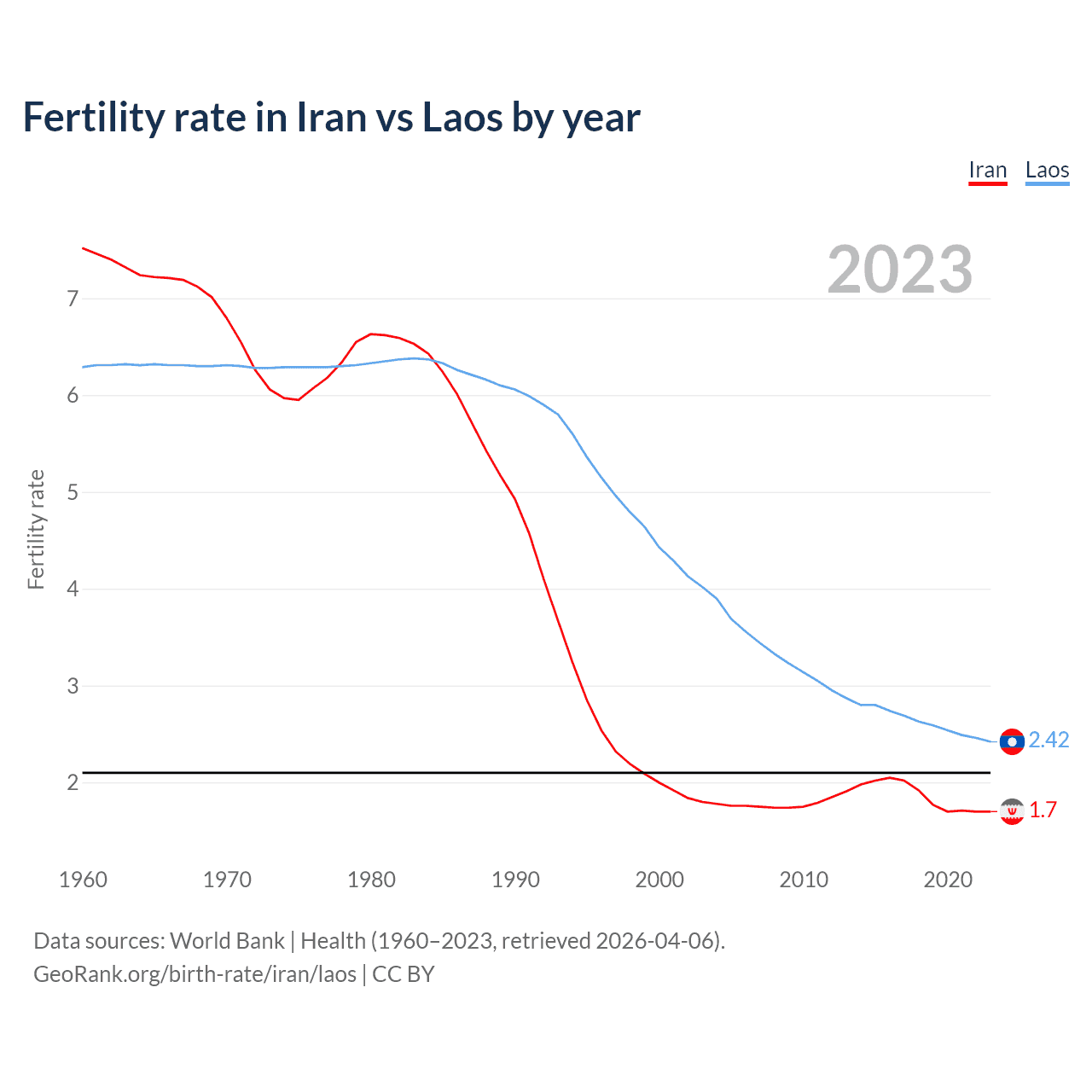 According to the latest available data on birth rates, the fertility rate in Iran was 1.7 children per woman in 2023, compared to 2.42 in Laos in 2023. The replacement level is considered to be 2.1 children per woman.