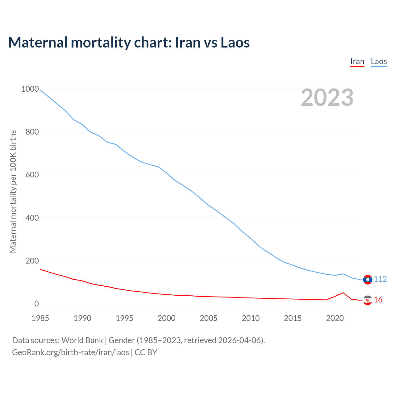 The maternal mortality rate, which is the probability of dying during childbirth or within 42 days of pregnancy termination, is 16 deaths per 100,000 live births in Iran, compared to 112 deaths in Laos.