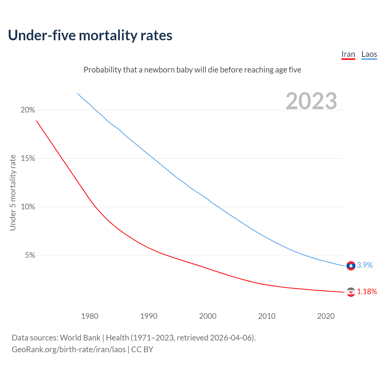 The chance that a newborn baby will die before reaching age five is 1.18% in Iran and 3.9% in Laos. Above is a chart with historical data on under-five mortality rates.