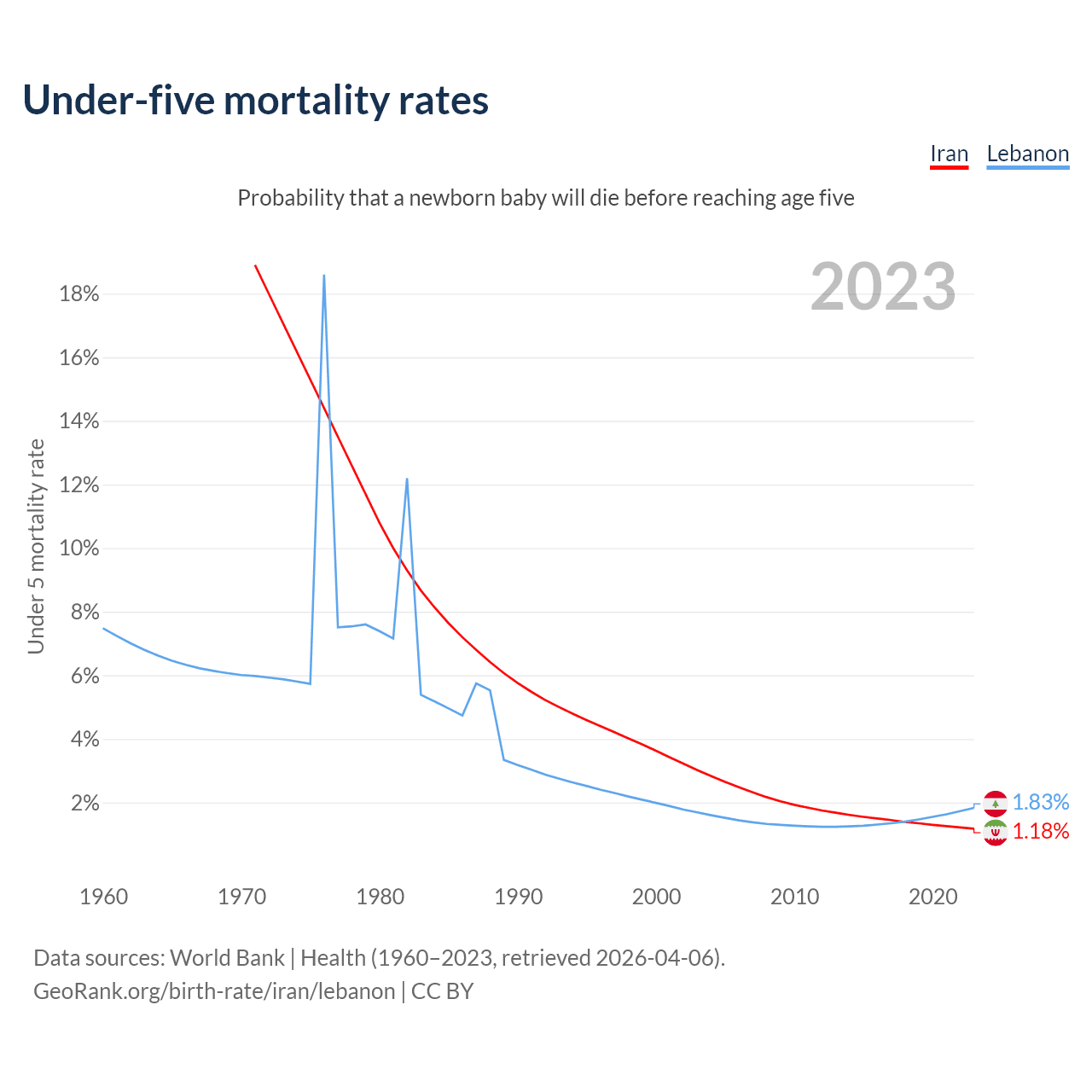 The chance that a newborn baby will die before reaching age five is 1.18% in Iran and 1.83% in Lebanon. Above is a chart with historical data on under-five mortality rates.