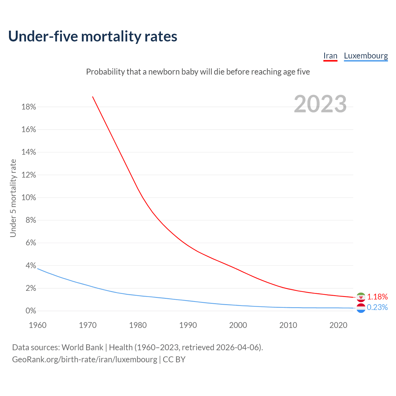 The chance that a newborn baby will die before reaching age five is 1.18% in Iran and 0.23% in Luxembourg. Above is a chart with historical data on under-five mortality rates.