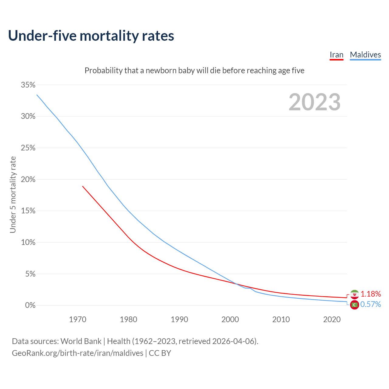 The chance that a newborn baby will die before reaching age five is 1.18% in Iran and 0.57% in Maldives. Above is a chart with historical data on under-five mortality rates.