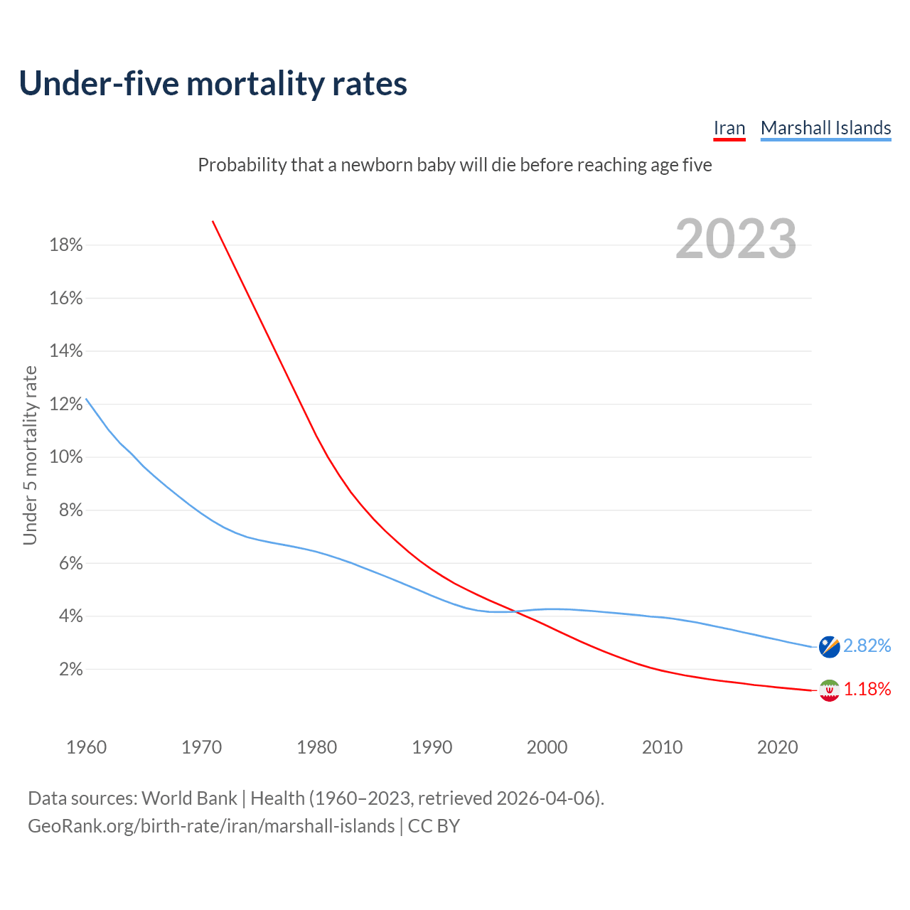 The chance that a newborn baby will die before reaching age five is 1.18% in Iran and 2.82% in the Marshall Islands. Above is a chart with historical data on under-five mortality rates.