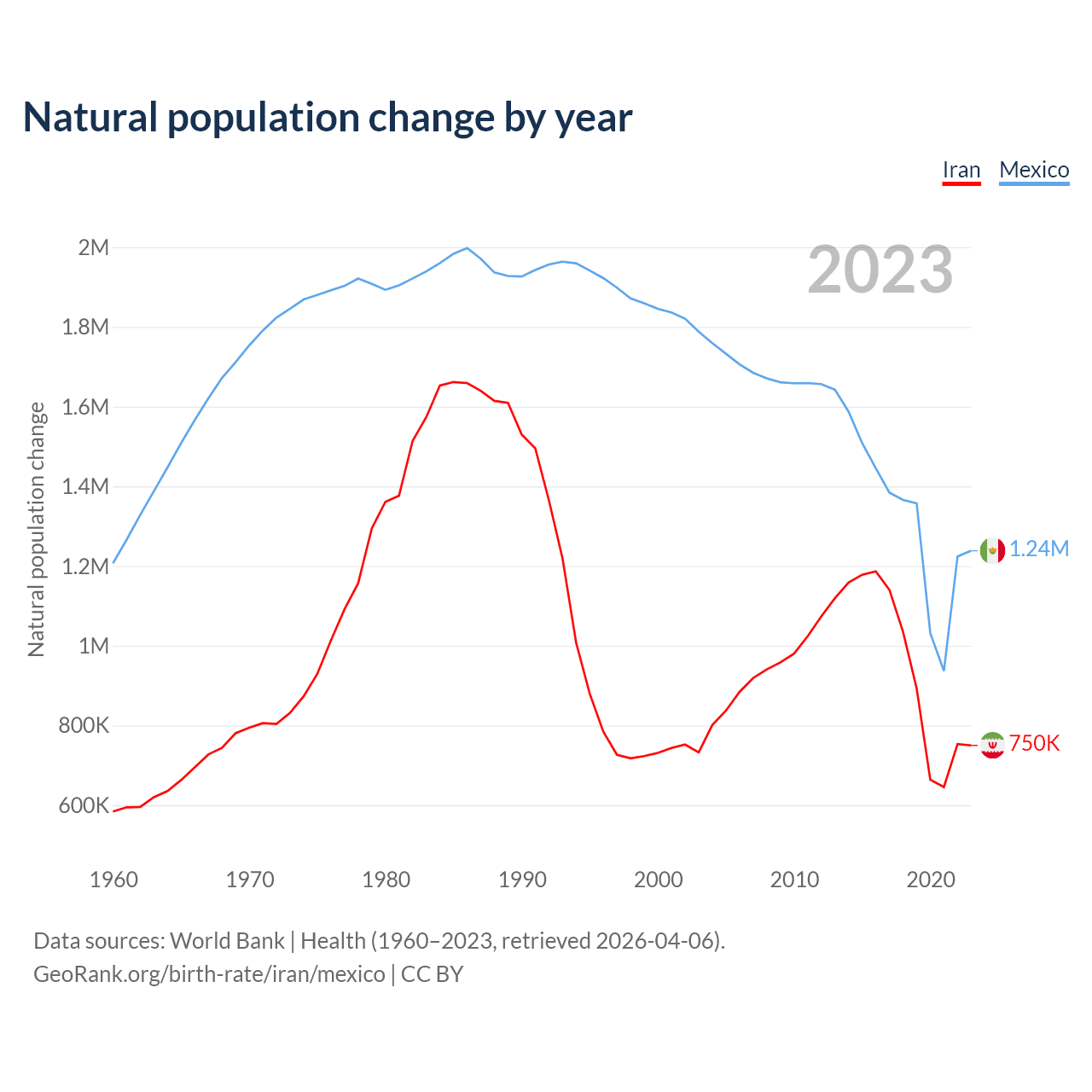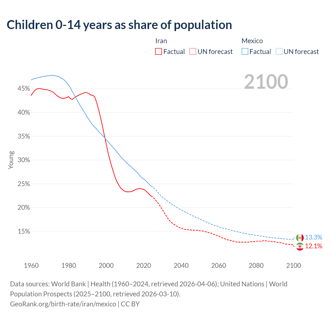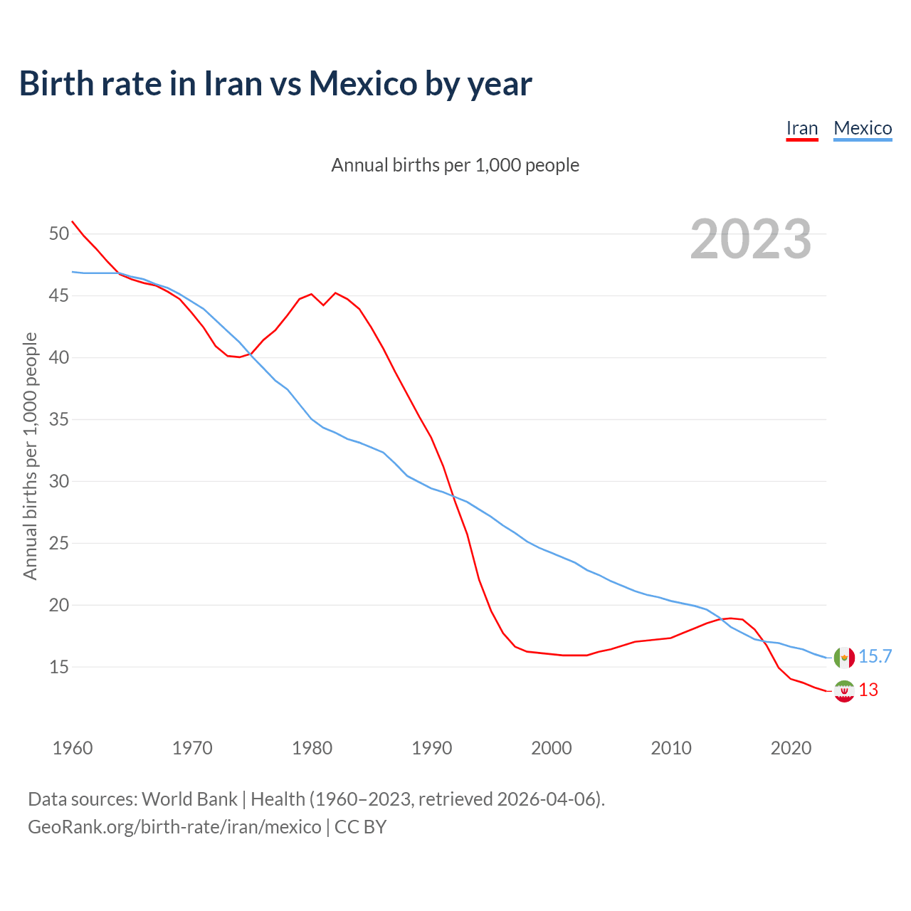 According to the latest available data on birth rates, the fertility rate in Iran was 1.7 children per woman in 2023, compared to 1.91 in Mexico in 2023. The replacement level is considered to be 2.1 children per woman.