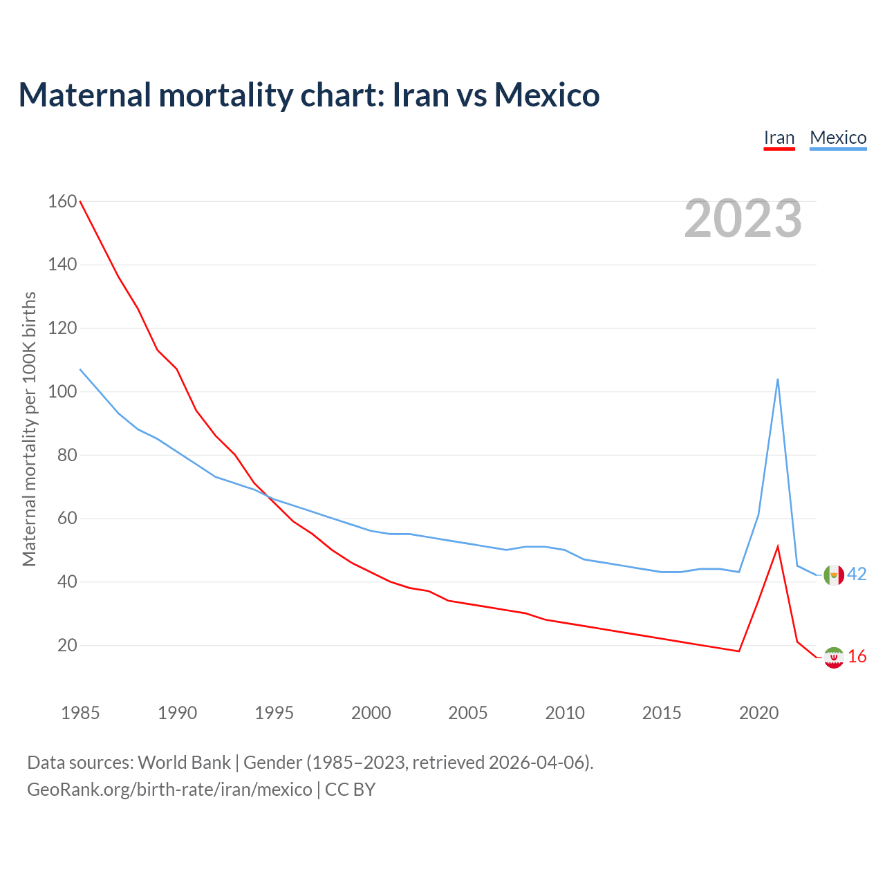 The maternal mortality rate, which is the probability of dying during childbirth or within 42 days of pregnancy termination, is 16 deaths per 100,000 live births in Iran, compared to 42 deaths in Mexico.