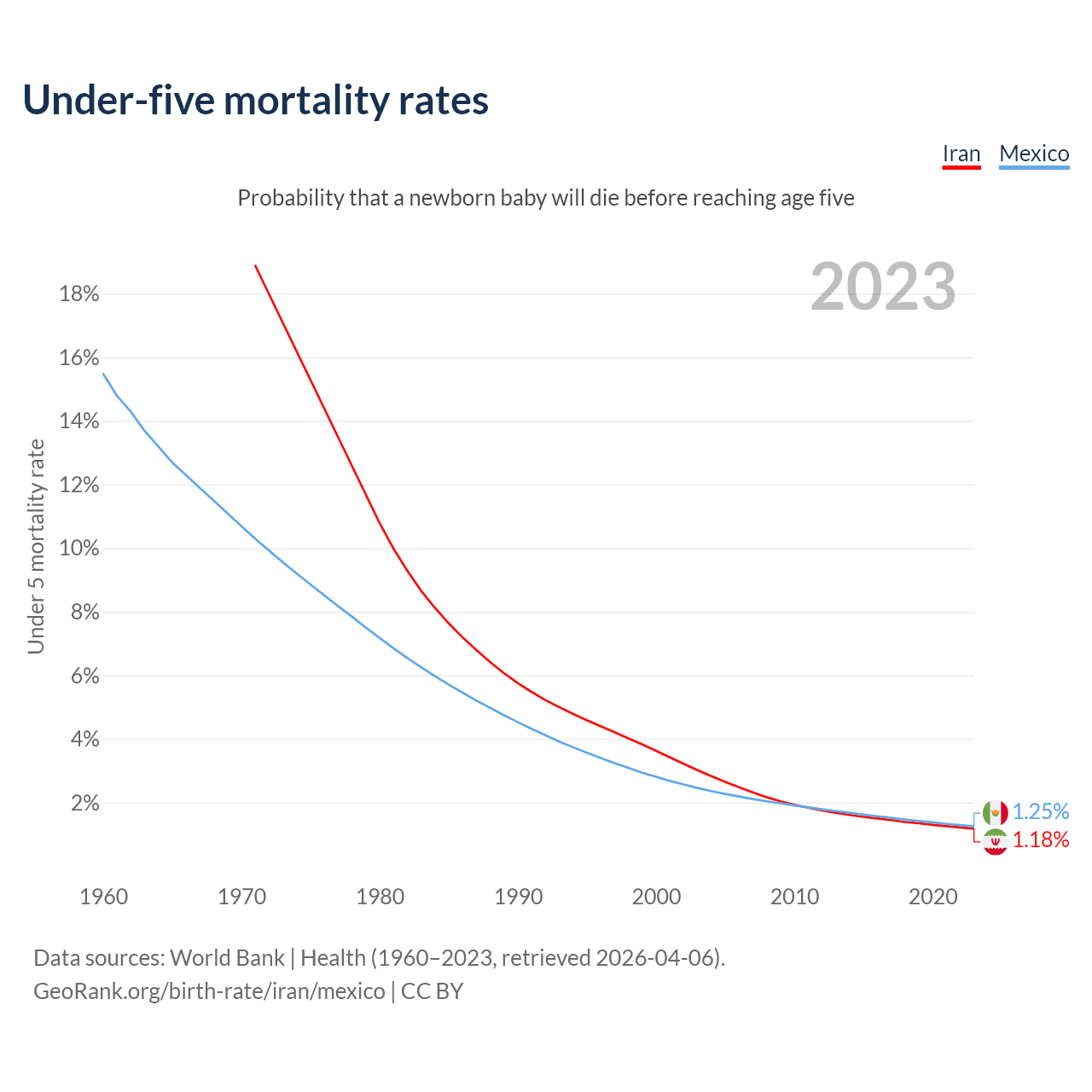 The chance that a newborn baby will die before reaching age five is 1.18% in Iran and 1.25% in Mexico. Above is a chart with historical data on under-five mortality rates.