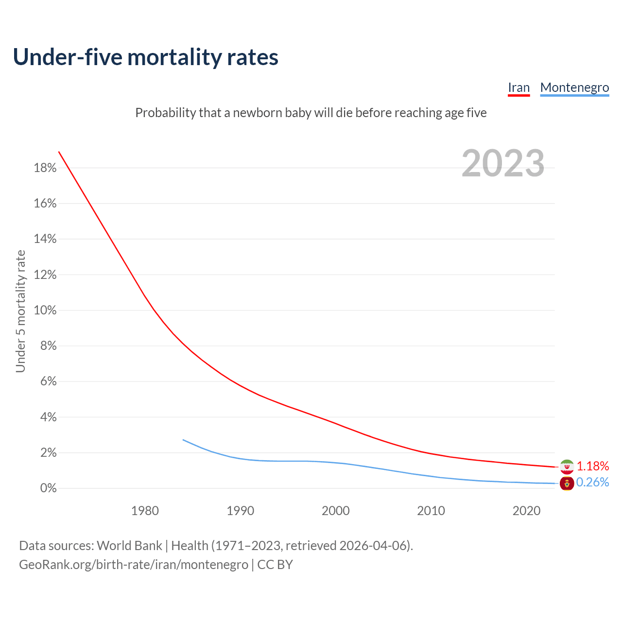 The chance that a newborn baby will die before reaching age five is 1.18% in Iran and 0.26% in Montenegro. Above is a chart with historical data on under-five mortality rates.
