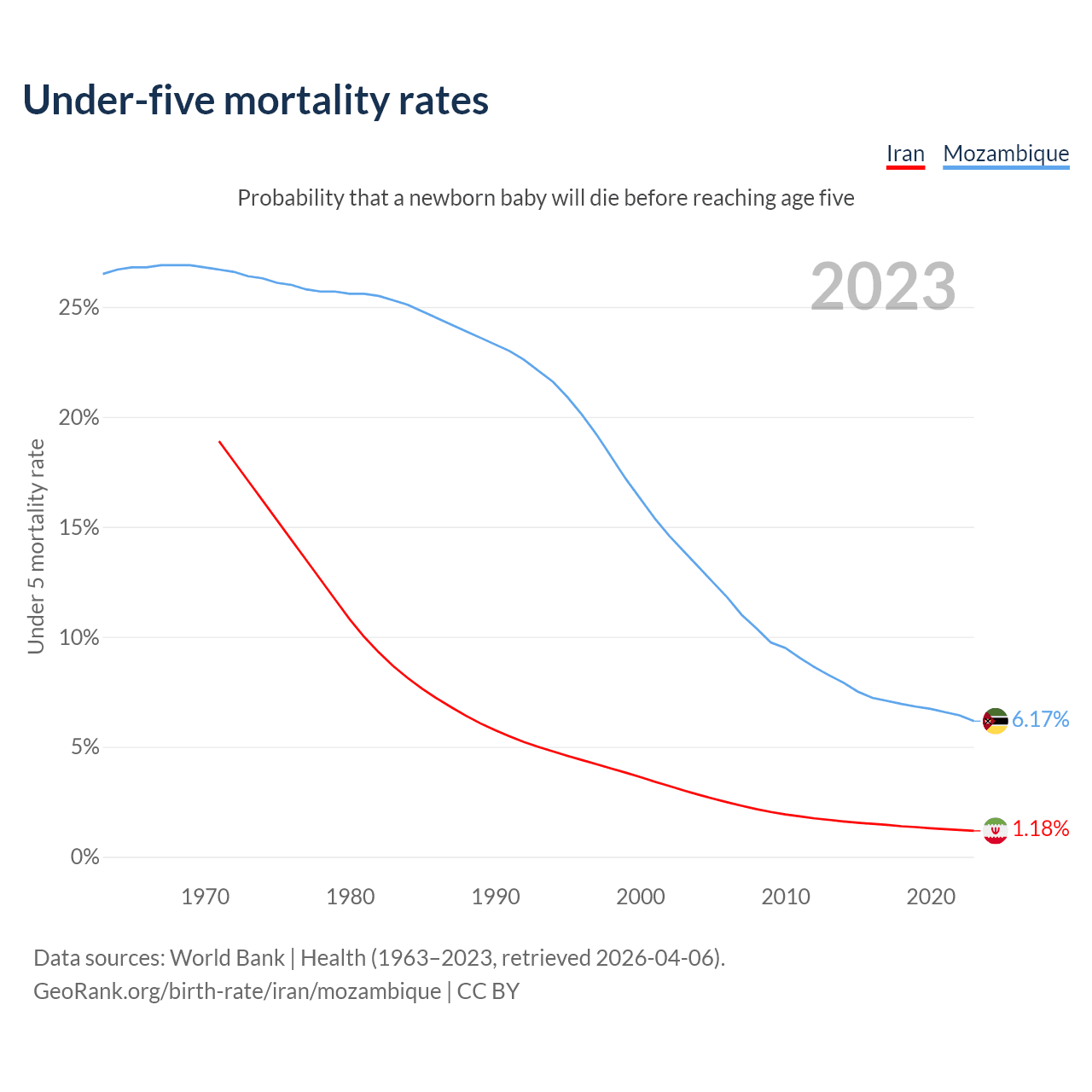 The chance that a newborn baby will die before reaching age five is 1.18% in Iran and 6.17% in Mozambique. Above is a chart with historical data on under-five mortality rates.
