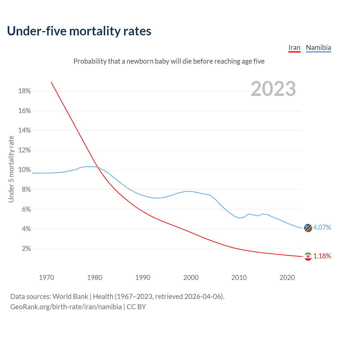 The chance that a newborn baby will die before reaching age five is 1.18% in Iran and 4.07% in Namibia. Above is a chart with historical data on under-five mortality rates.