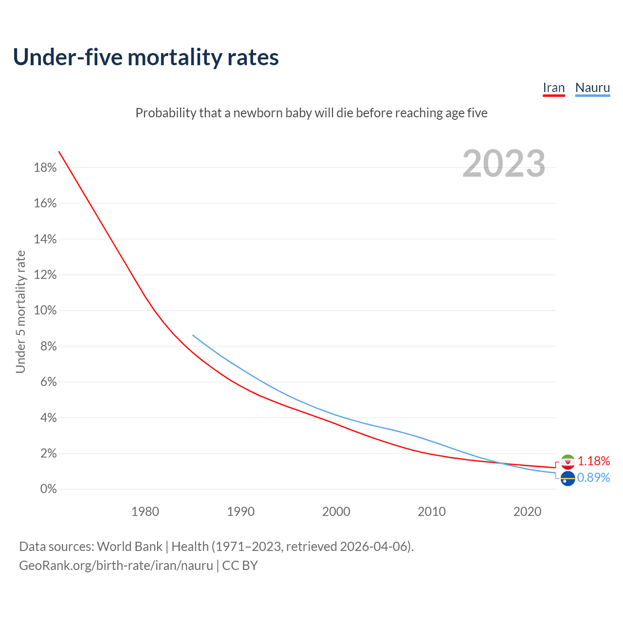 The chance that a newborn baby will die before reaching age five is 1.18% in Iran and 0.89% in Nauru. Above is a chart with historical data on under-five mortality rates.