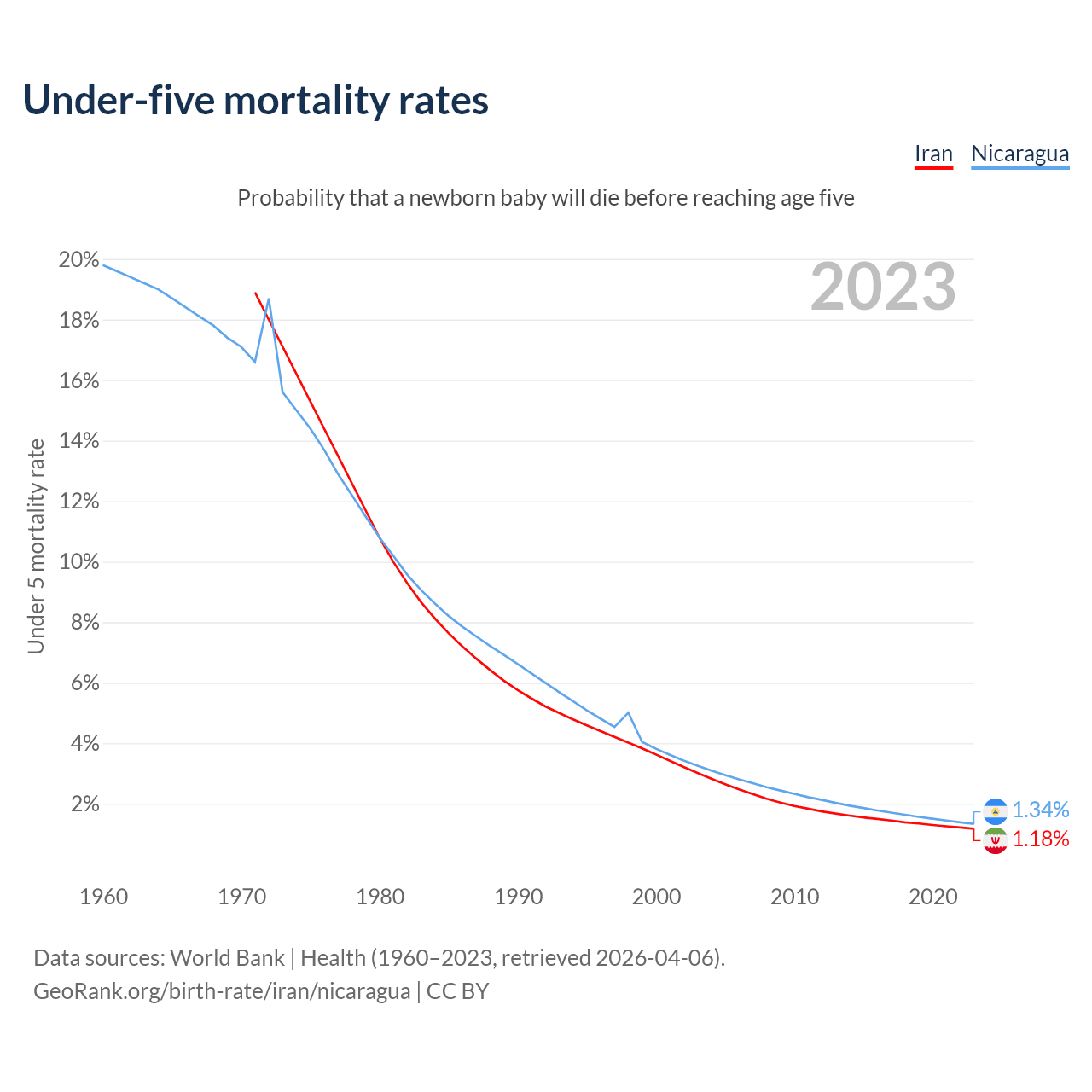 The chance that a newborn baby will die before reaching age five is 1.18% in Iran and 1.34% in Nicaragua. Above is a chart with historical data on under-five mortality rates.