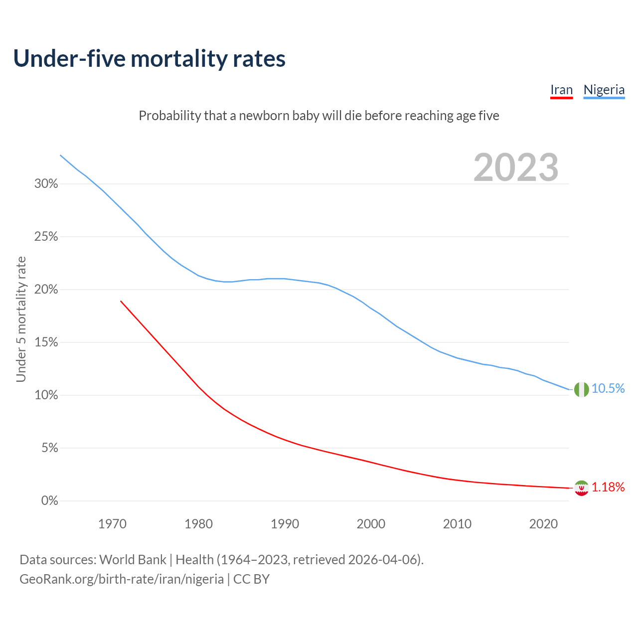 The chance that a newborn baby will die before reaching age five is 1.18% in Iran and 10.5% in Nigeria. Above is a chart with historical data on under-five mortality rates.