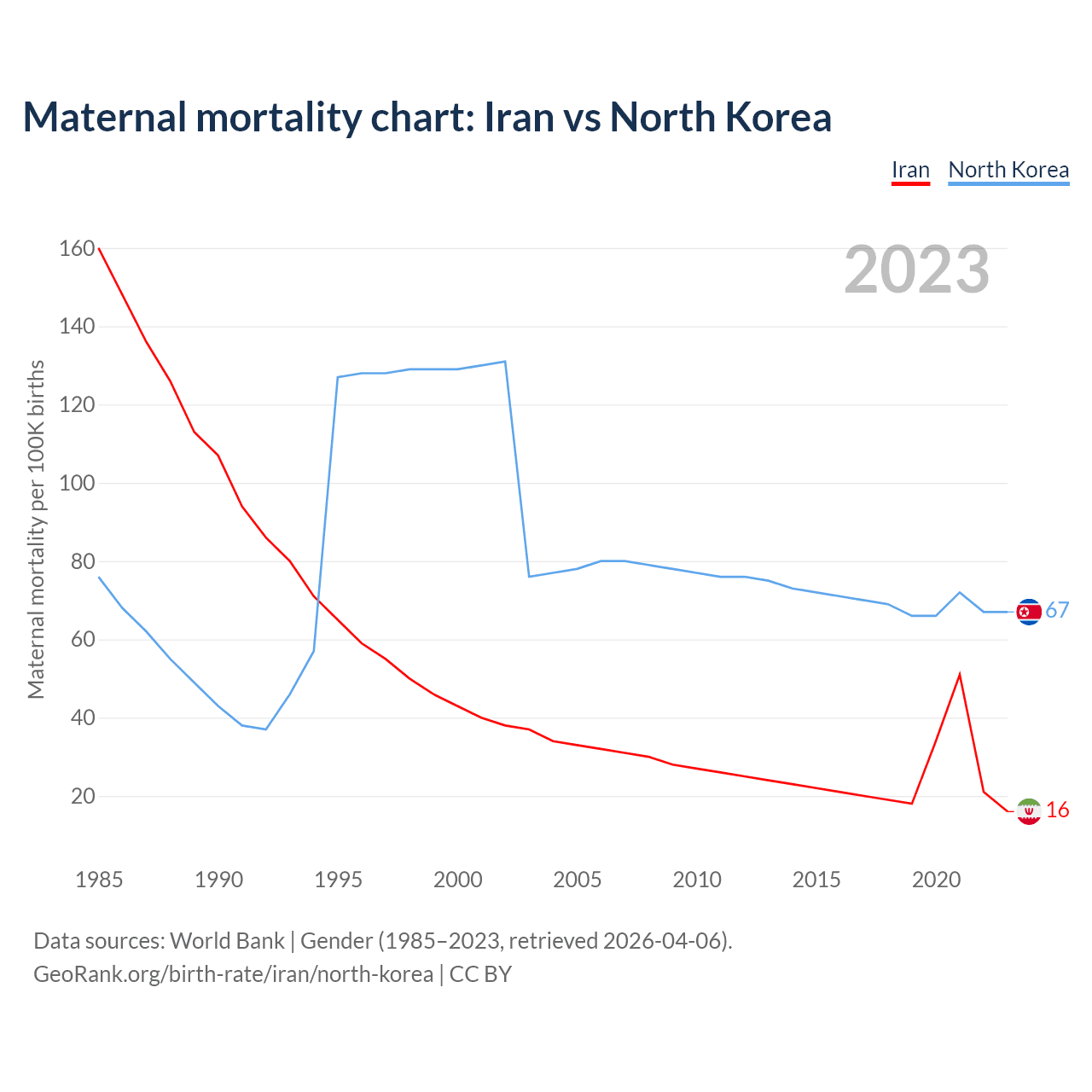 The maternal mortality rate, which is the probability of dying during childbirth or within 42 days of pregnancy termination, is 16 deaths per 100,000 live births in Iran, compared to 67 deaths in North Korea.