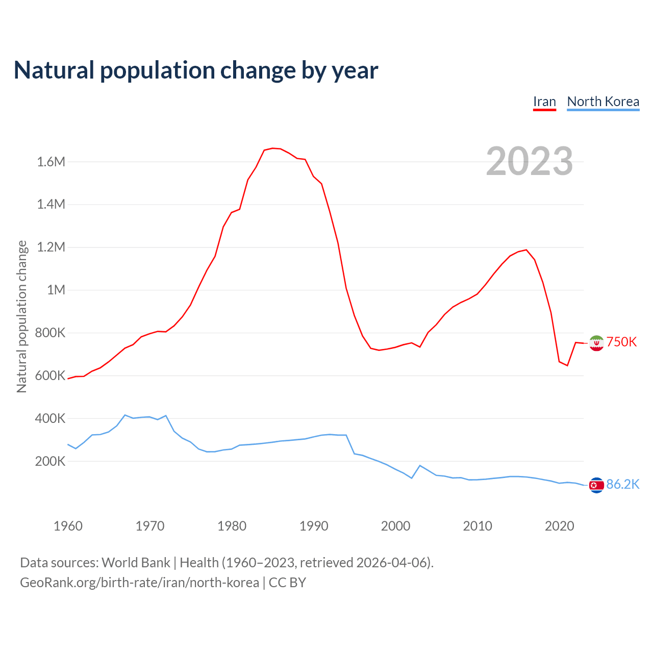 Iran has an annual birth rate of 13 births per 1,000 people, compared to 12.9 for North Korea. The average number of children a woman is expected to have during her lifetime — the fertility rate, is 1.7 in Iran and 1.78 in North Korea — 5.01% difference.