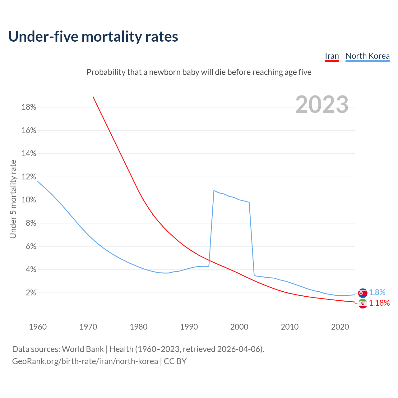 The chance that a newborn baby will die before reaching age five is 1.18% in Iran and 1.8% in North Korea. Above is a chart with historical data on under-five mortality rates.